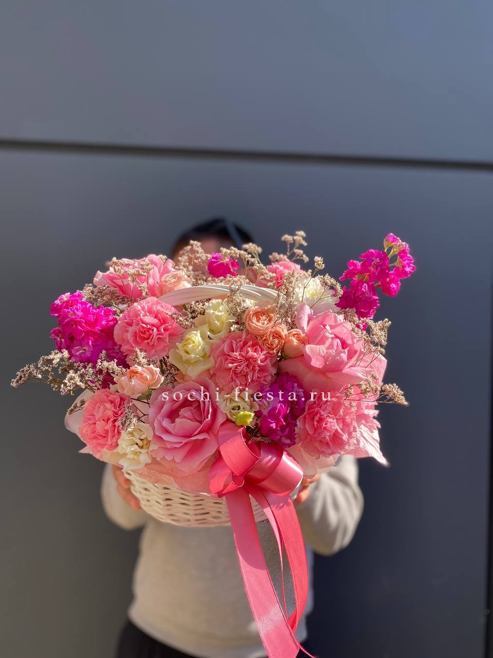 Корзина объединяет гортензии, эустомы, розы и маттиолу в многослойную композицию. Разные фактуры лепестков создают визуальную глубину и насыщенность.