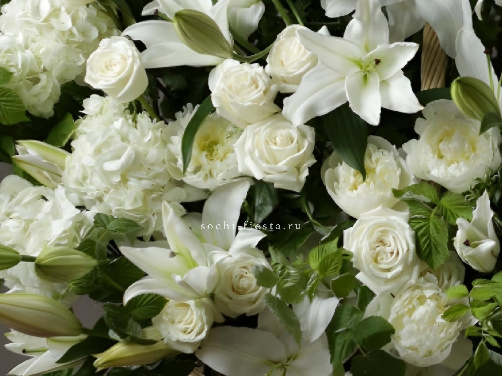 пионы, возможна замена, в зависимости от сезонности, розы кустовые пионовидные, розы одноголовые, гортензии, маттиола (аналог), эустома, эвкалипт.