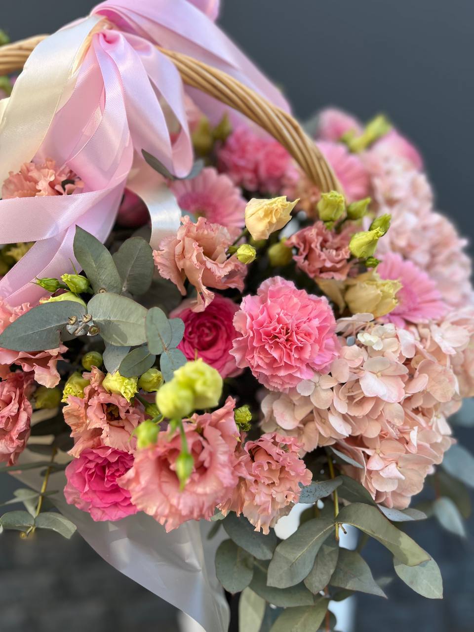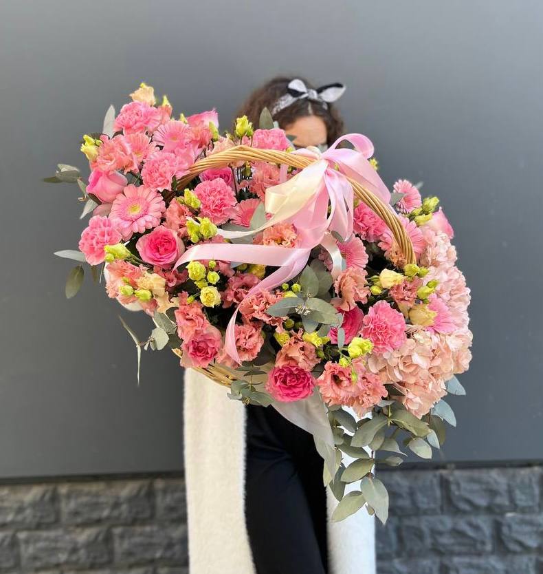 Плотная сферическая форма из пышных бутонов создаёт объёмную композицию в плетёной корзине. Ветки эвкалипта добавляют воздушности между головками цветов. Классическое решение для яркого события или знакового дня в жизни близкого человека.