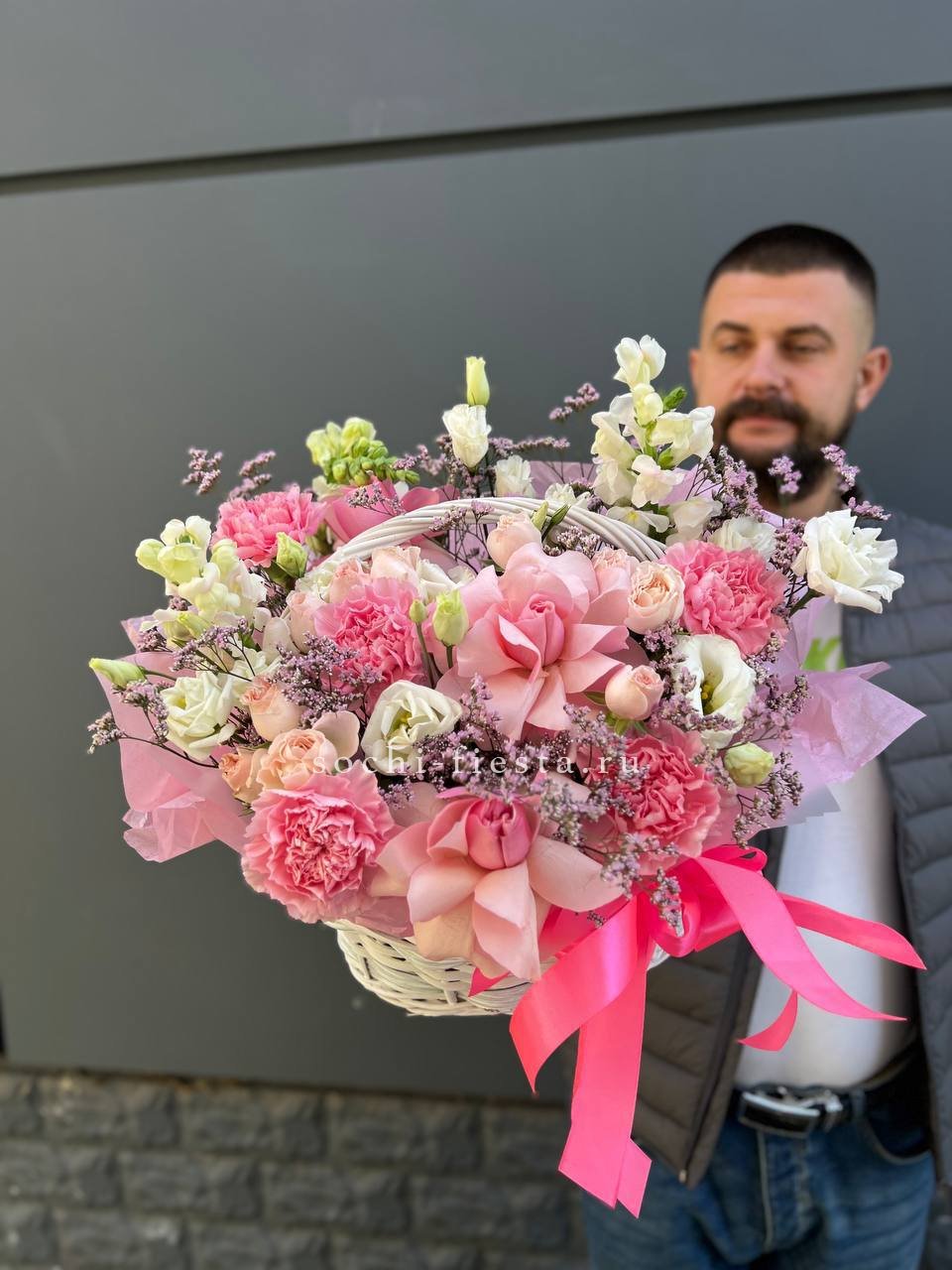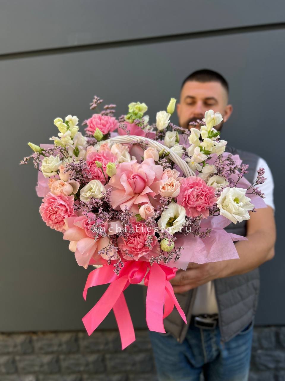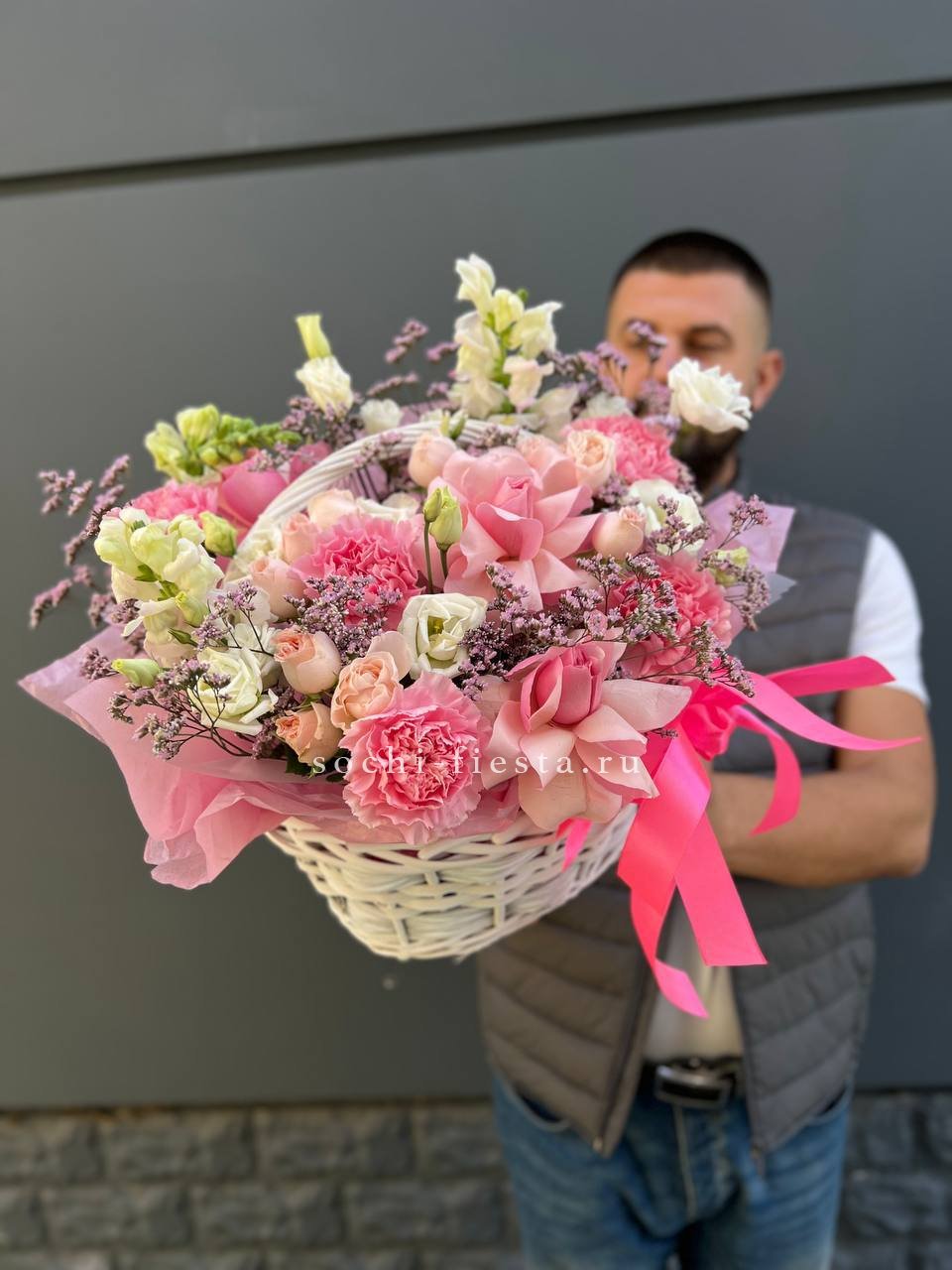 Диантусы создают воздушную текстуру, розы добавляют объем, а эустома раскрывается мягкими волнами. Композиция собрана в корзине и держит форму без лишних деталей.