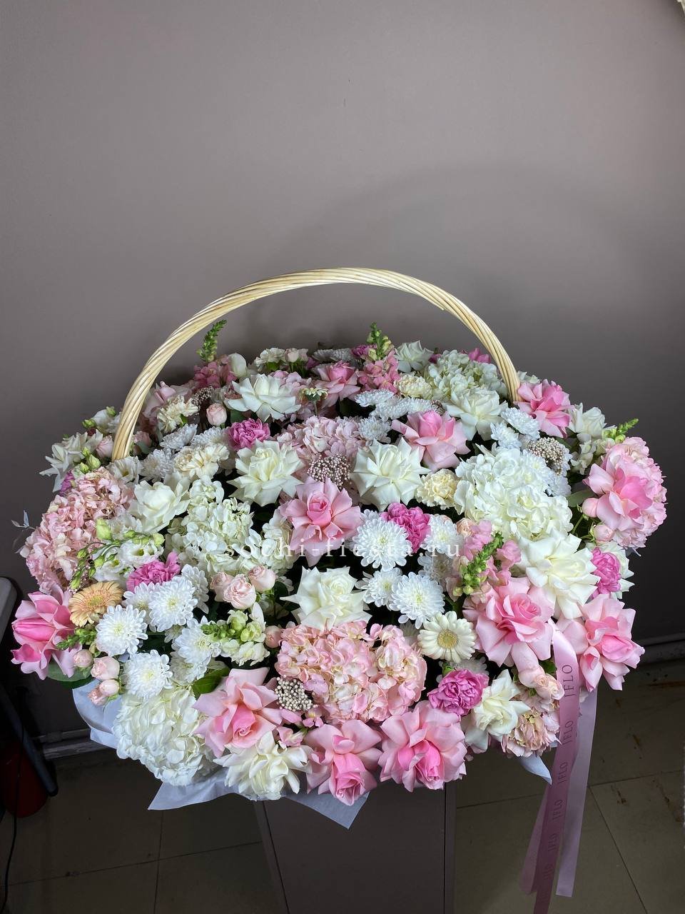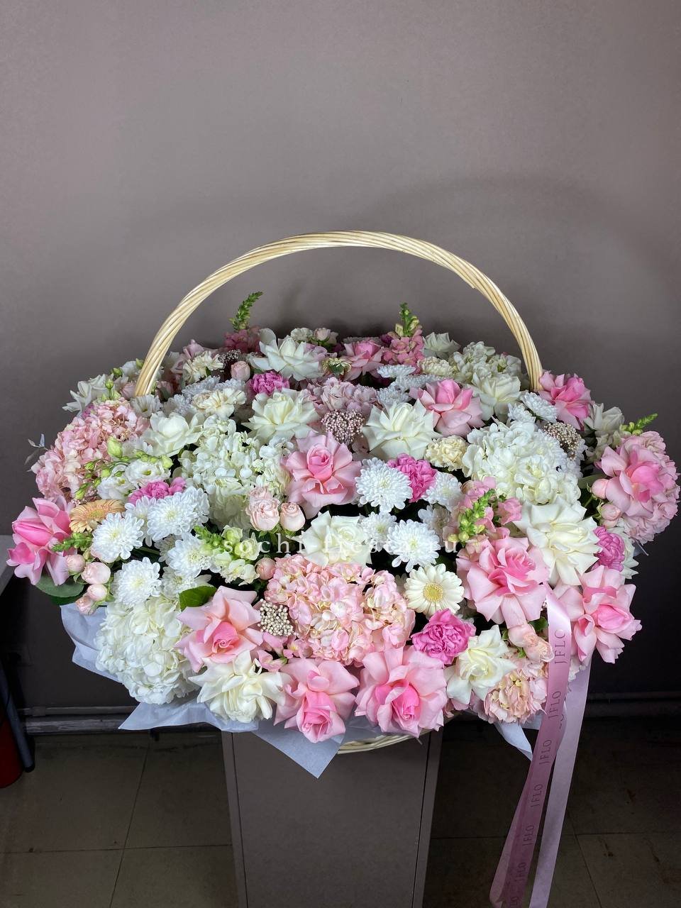 Монументальная композиция из полутора сотен белоснежных бутонов создает впечатление цветочного облака. Корзина придает устойчивость и завершенность форме, позволяя разместить такой масштабный ансамбль в любом пространстве.