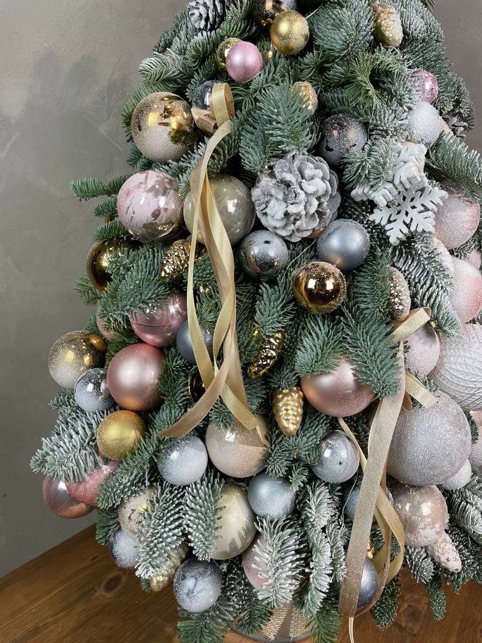 Пышная конструкция из веток датского нобилиса создает праздничный объем и заполняет пространство живой хвоей. Шары и ленты добавляют завершенность композиции. Готовое решение для создания новогоднего настроения в интерьере.