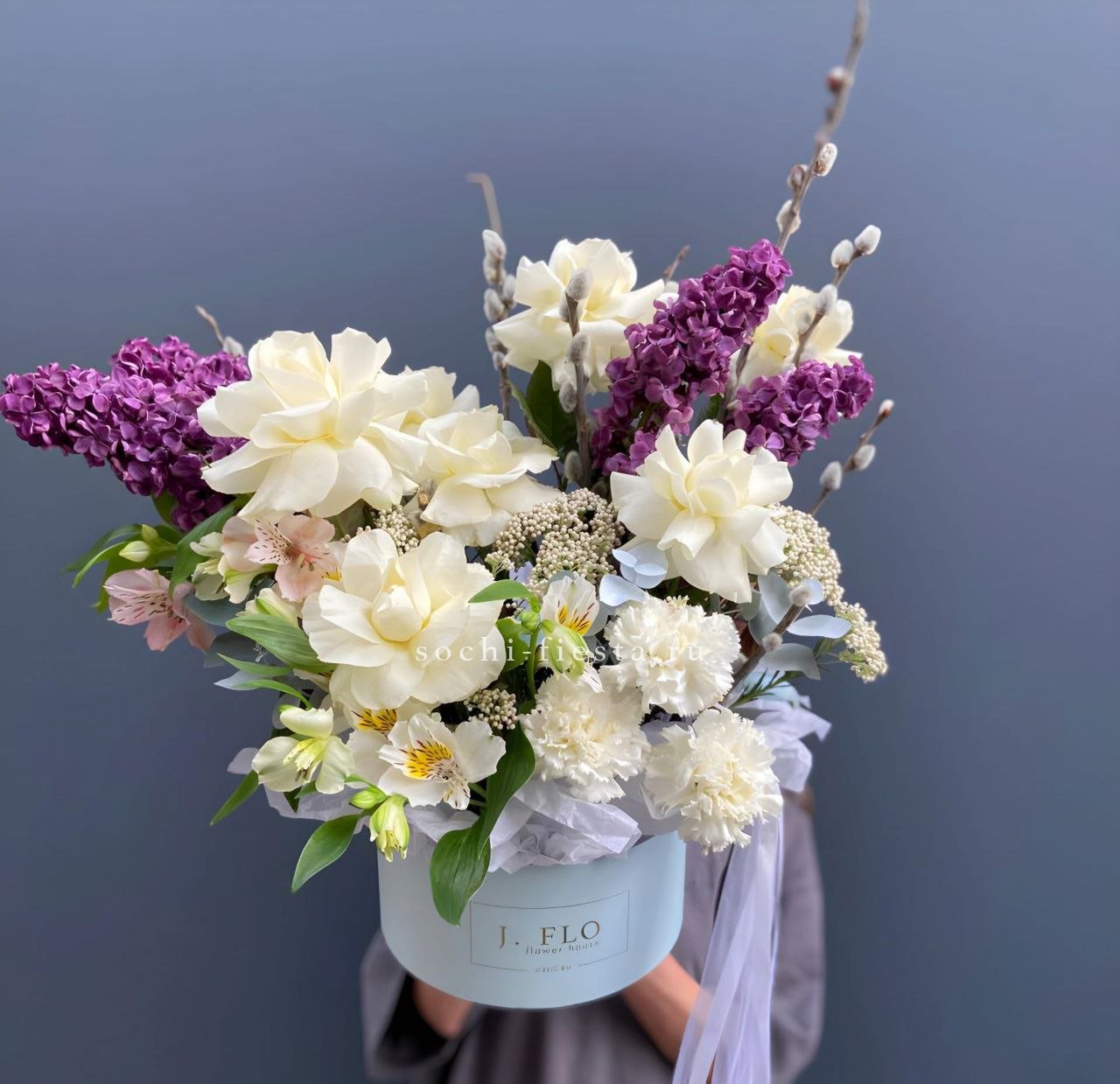 Весенняя композиция объединяет пушистые ветви вербы с бутонами белых роз и соцветиями сирени. Диантусы и озотамнус создают объёмную текстуру, а сама форма бокса делает композицию устойчивой и завершённой. Подходит для светлых праздников и семейных встреч.