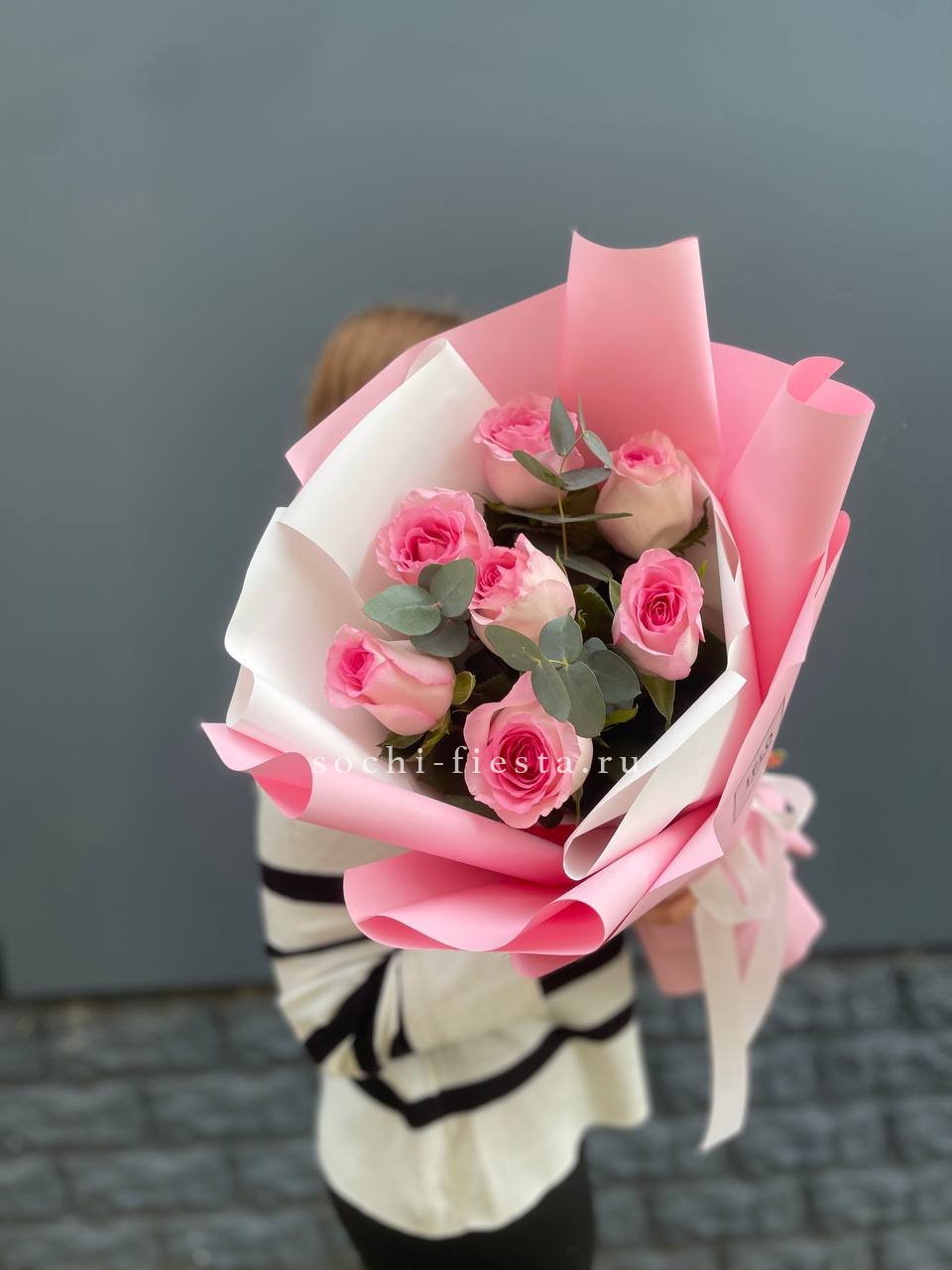 Семь пионовидных роз образуют компактный букет с мягкими линиями и спокойным ритмом. Ветви эвкалипта добавляют воздушности и завершают композицию.