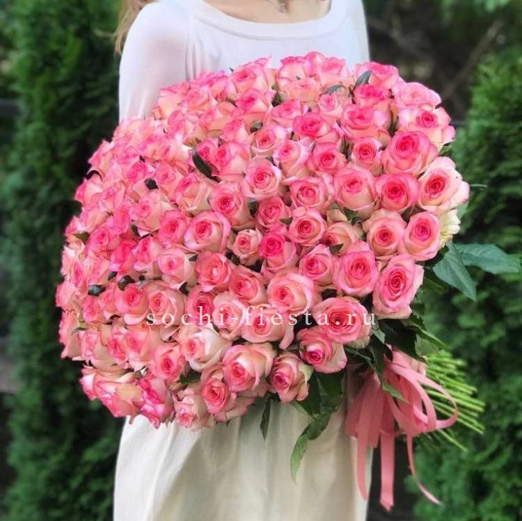 Розы Karolina раскрываются плавными переходами нежно-розовых оттенков. Сто один бутон выстраивается в плотную композицию с мягким цветовым звучанием.
