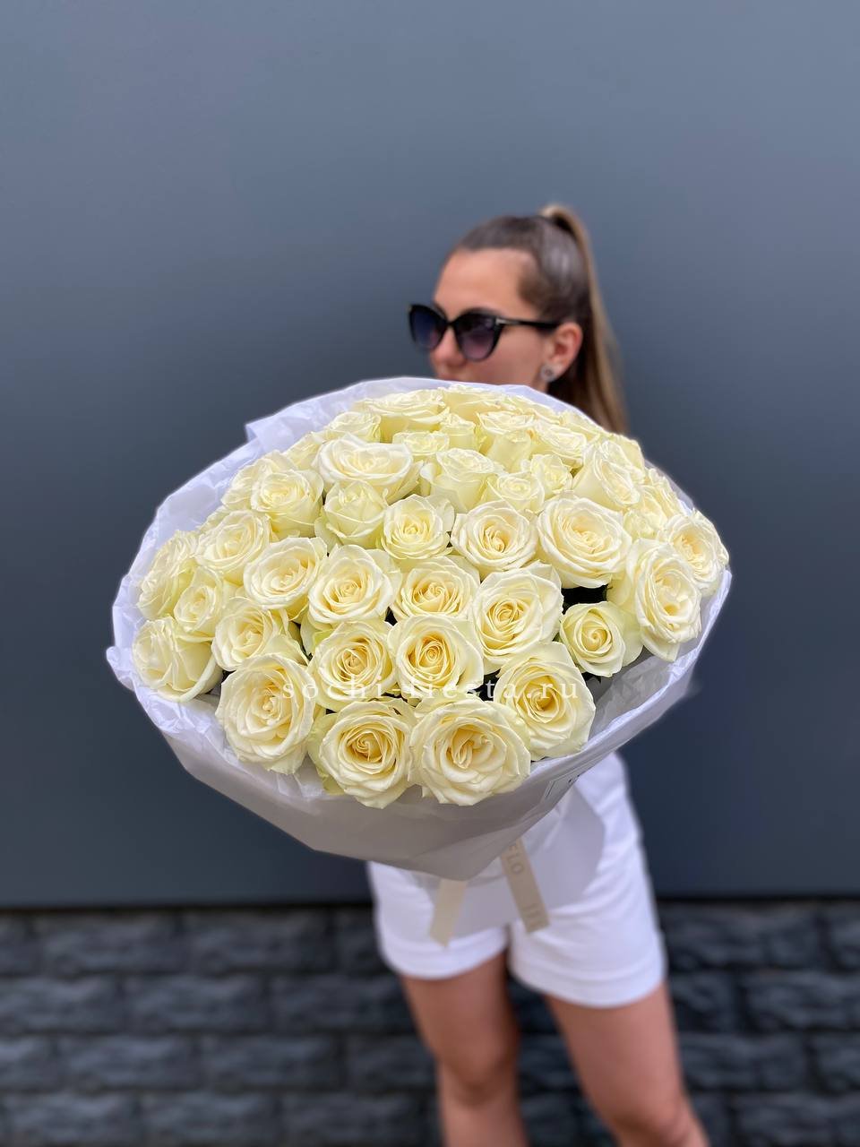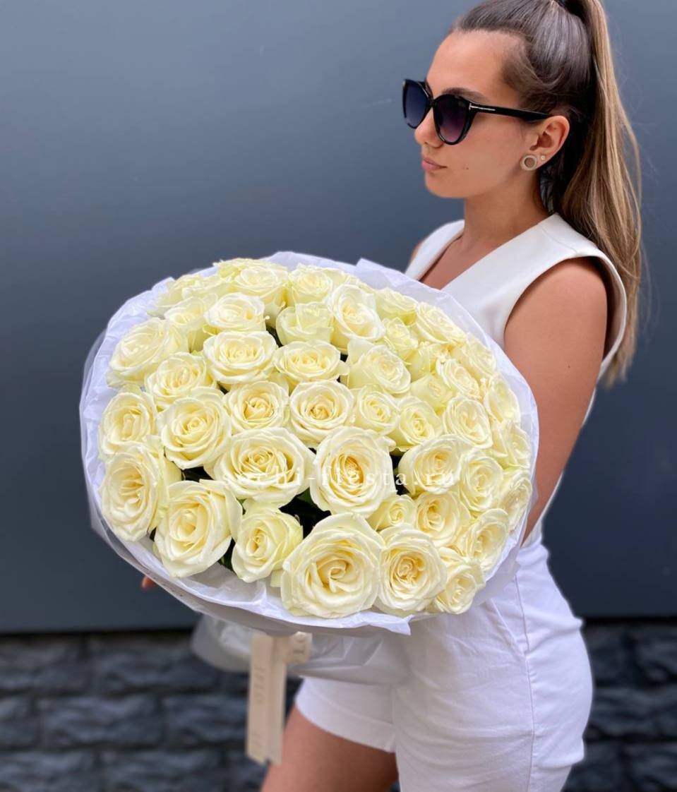 Девятнадцать белых роз в лаконичной крафтовой упаковке держат чёткий силуэт. Прямые стебли и плотные бутоны создают графичную композицию.