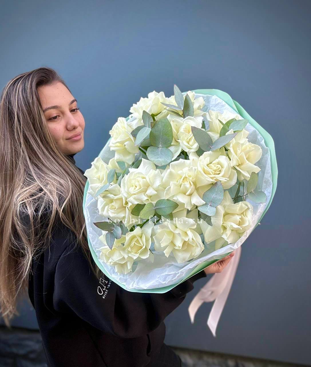Пятьдесят один бутон выстраиваются в объёмную сферу с чёткой геометрией. Белые розы держат форму и создают ощутимое визуальное присутствие. Букет занимает пространство уверенно и спокойно.