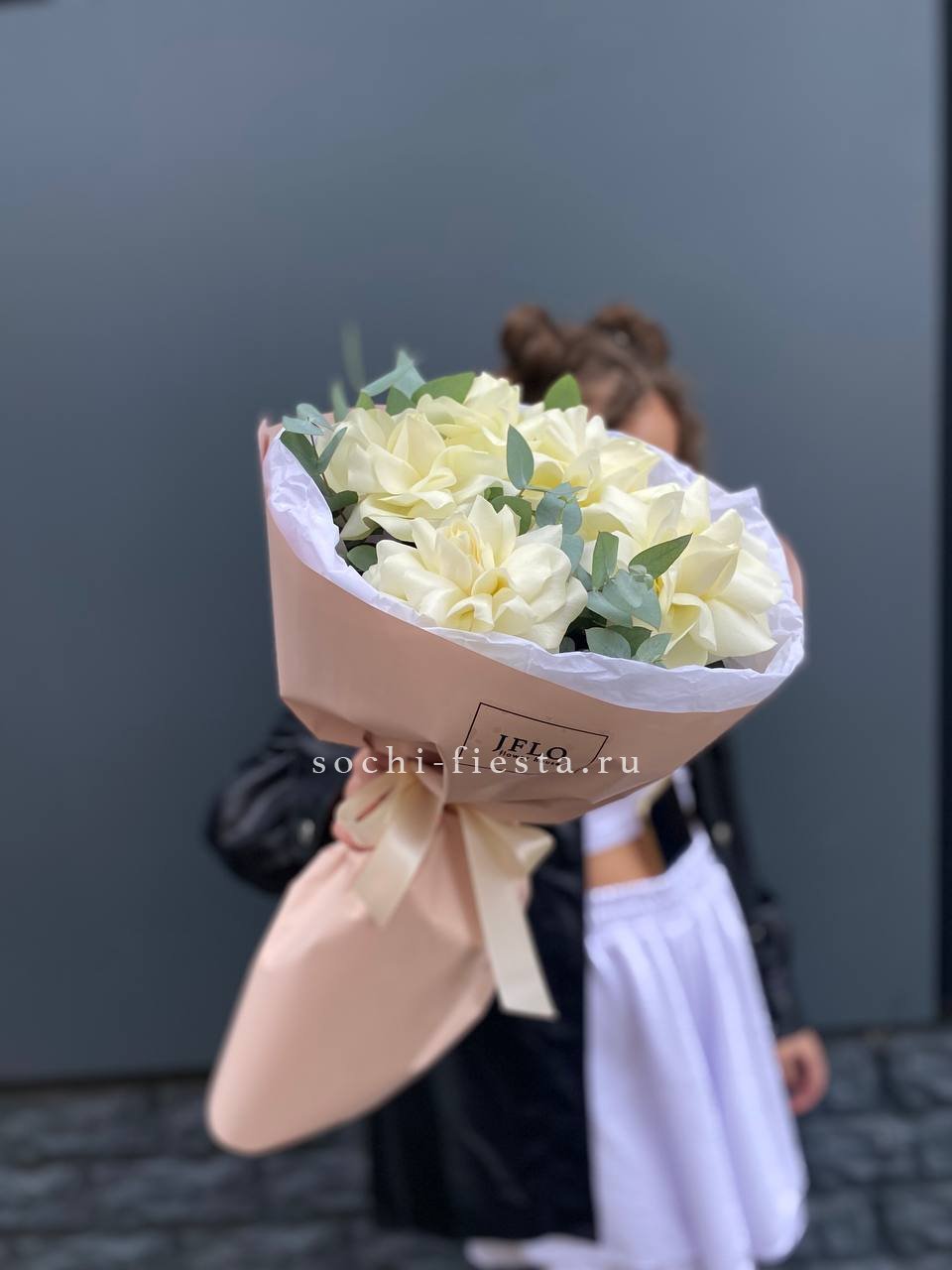 Пятнадцать белых роз в тонкой дизайнерской упаковке создают ощущение лёгкости и чистоты. Матовая текстура бумаги и мягкие складки подчёркивают форму каждого бутона. Композиция выглядит свежо и современно.