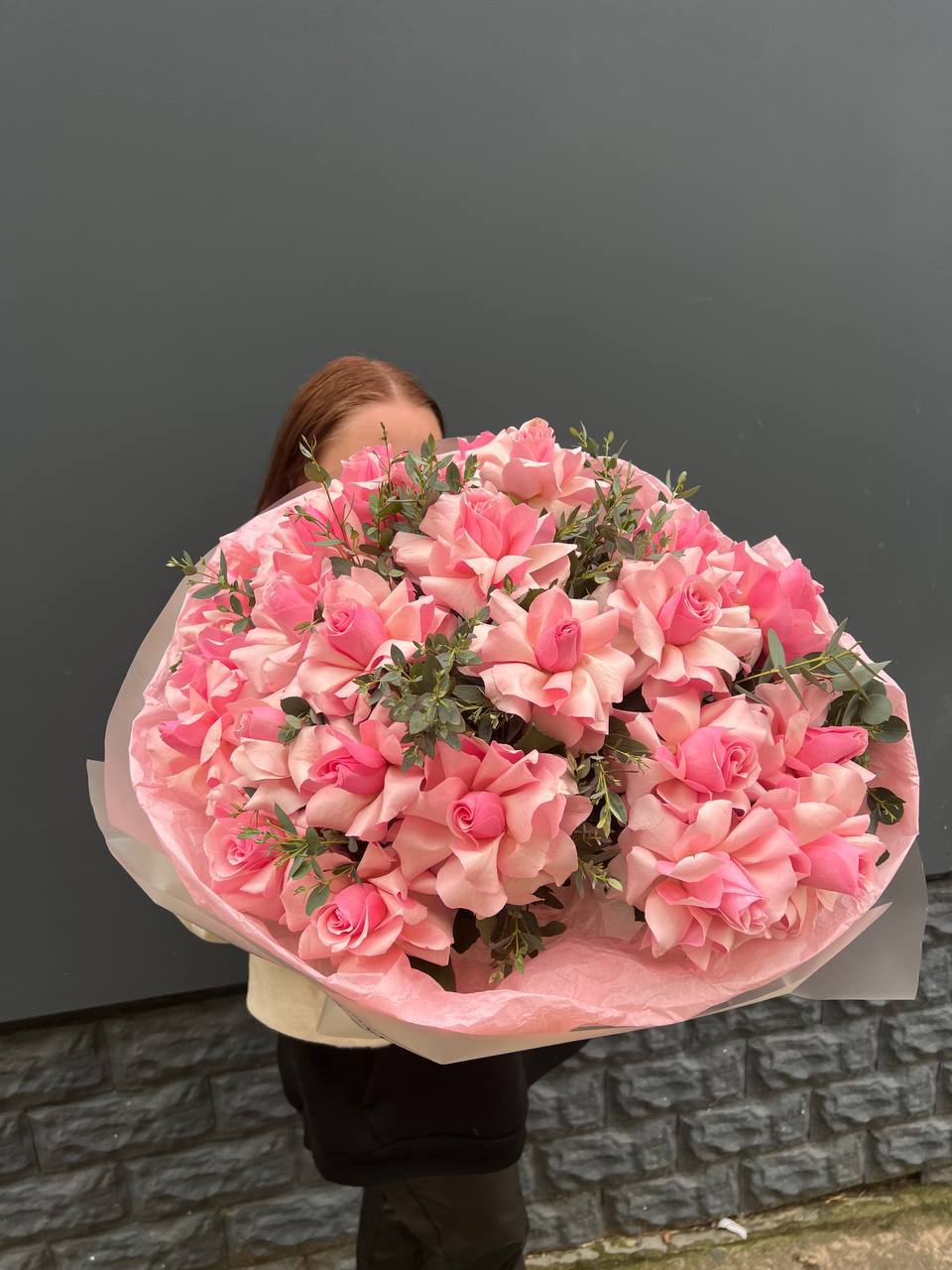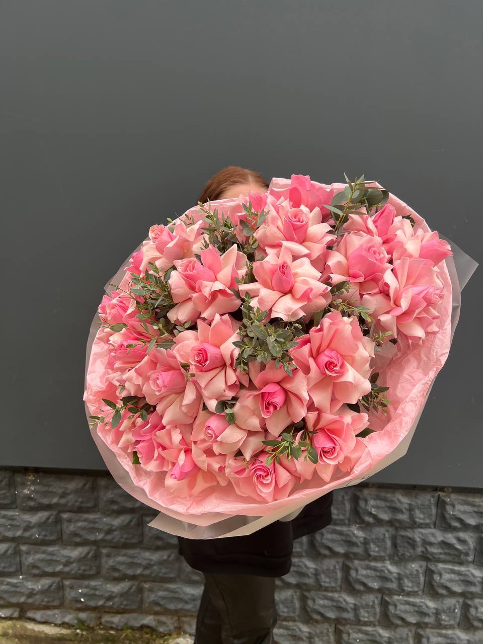 Семнадцать бутонов создают пышный объём и уверенное присутствие в любом пространстве. Розовый тон дополнен матовой зеленью эвкалипта. Букет держит форму и остаётся свежим долгое время.
