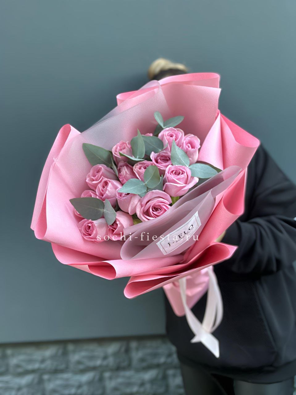 Девятнадцать бутонов раскрываются плавными волнами, создавая объёмную композицию с чёткими линиями. Розовый оттенок переходит от светлого к насыщенному, а эвкалипт добавляет воздушности между соцветиями. Букет держит форму и выглядит самодостаточно.