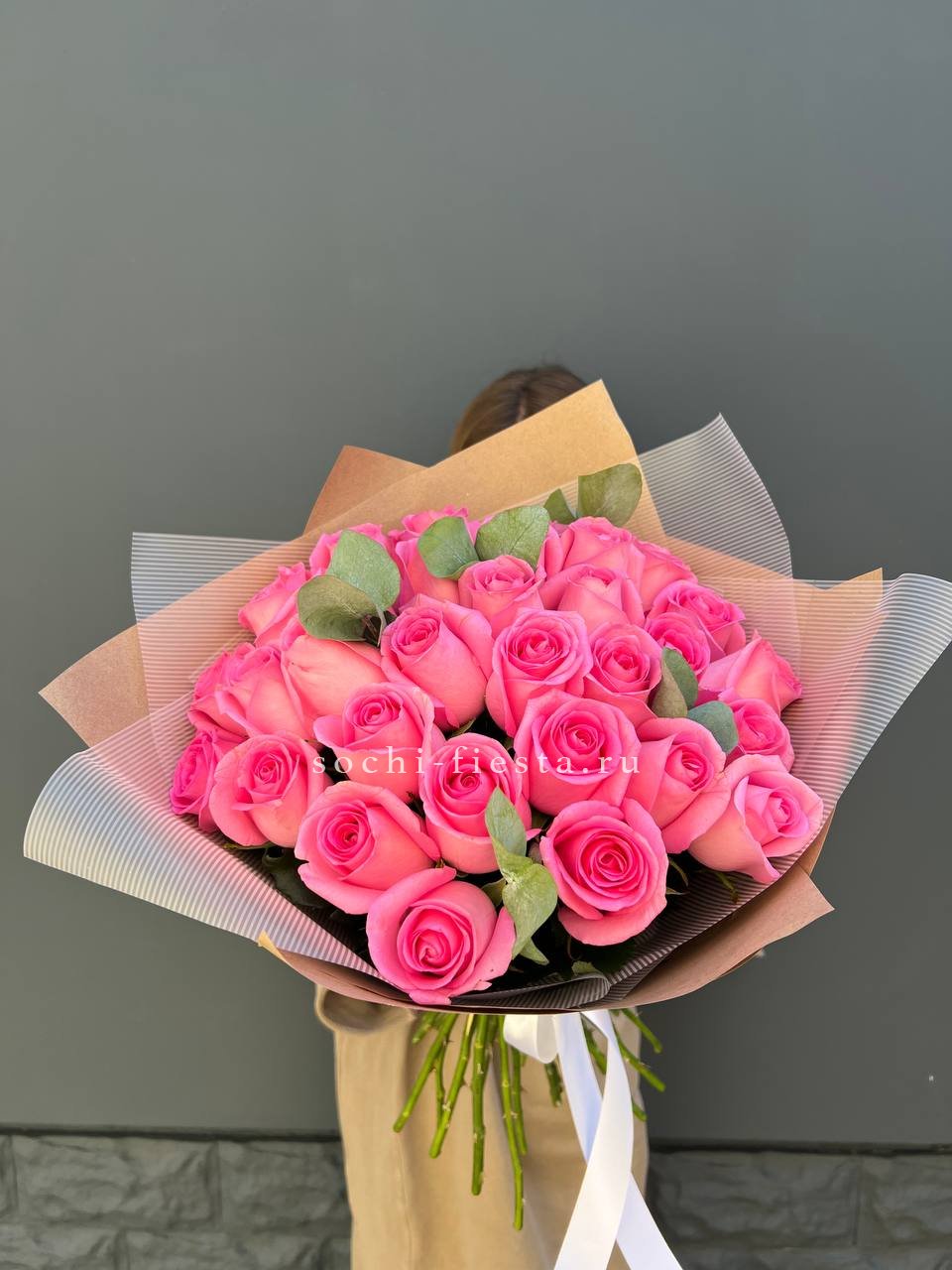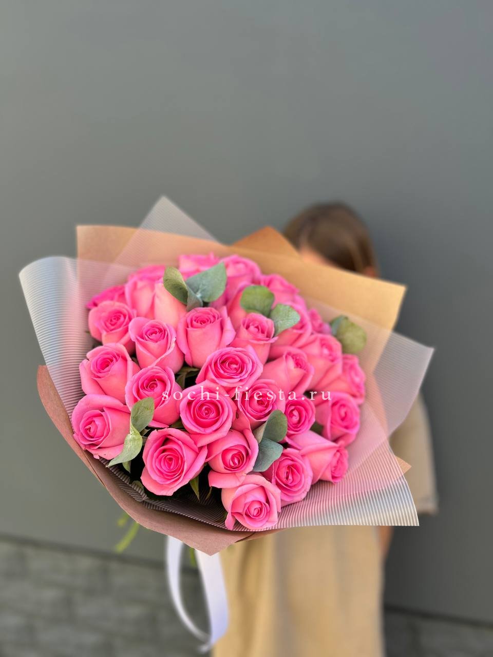 25 розовых роз, лента, дизайнерская упаковка.