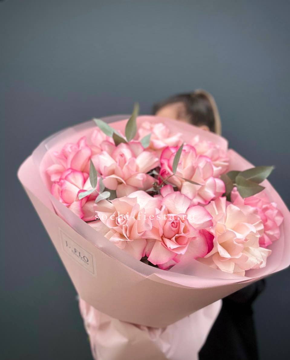 французские розы - 11 шт., эвкалипт - 1шт., лента, авторская упаковка.