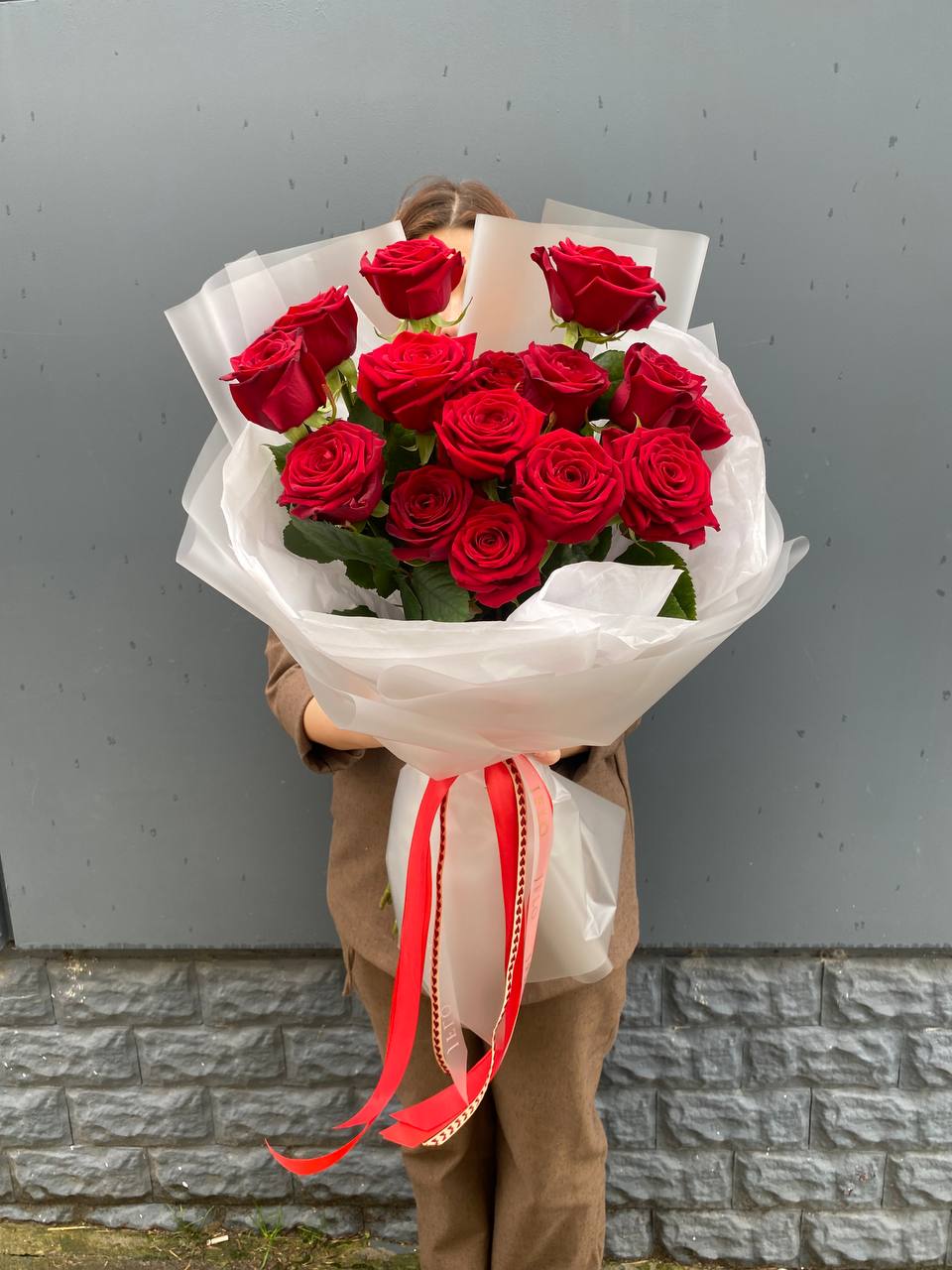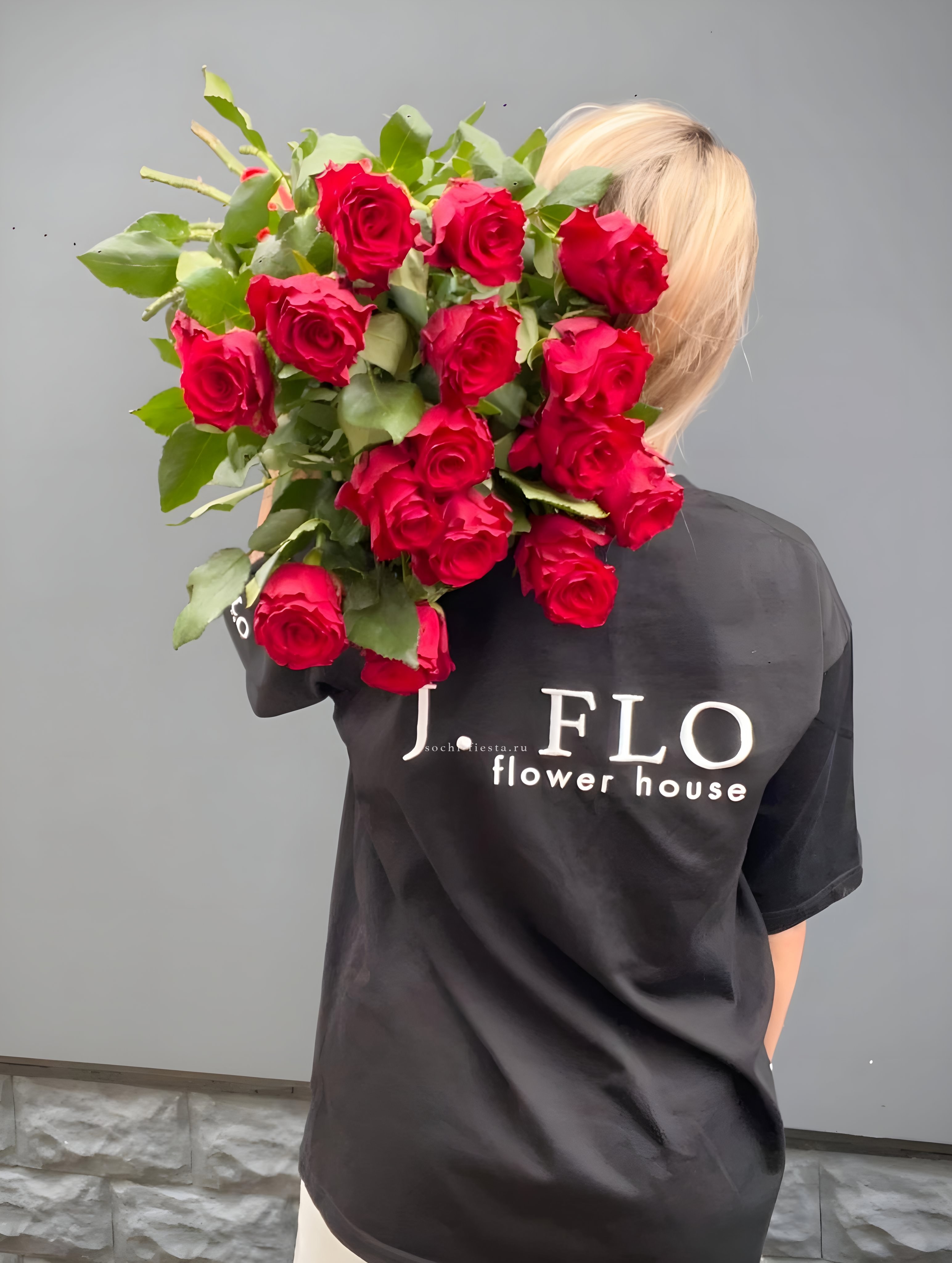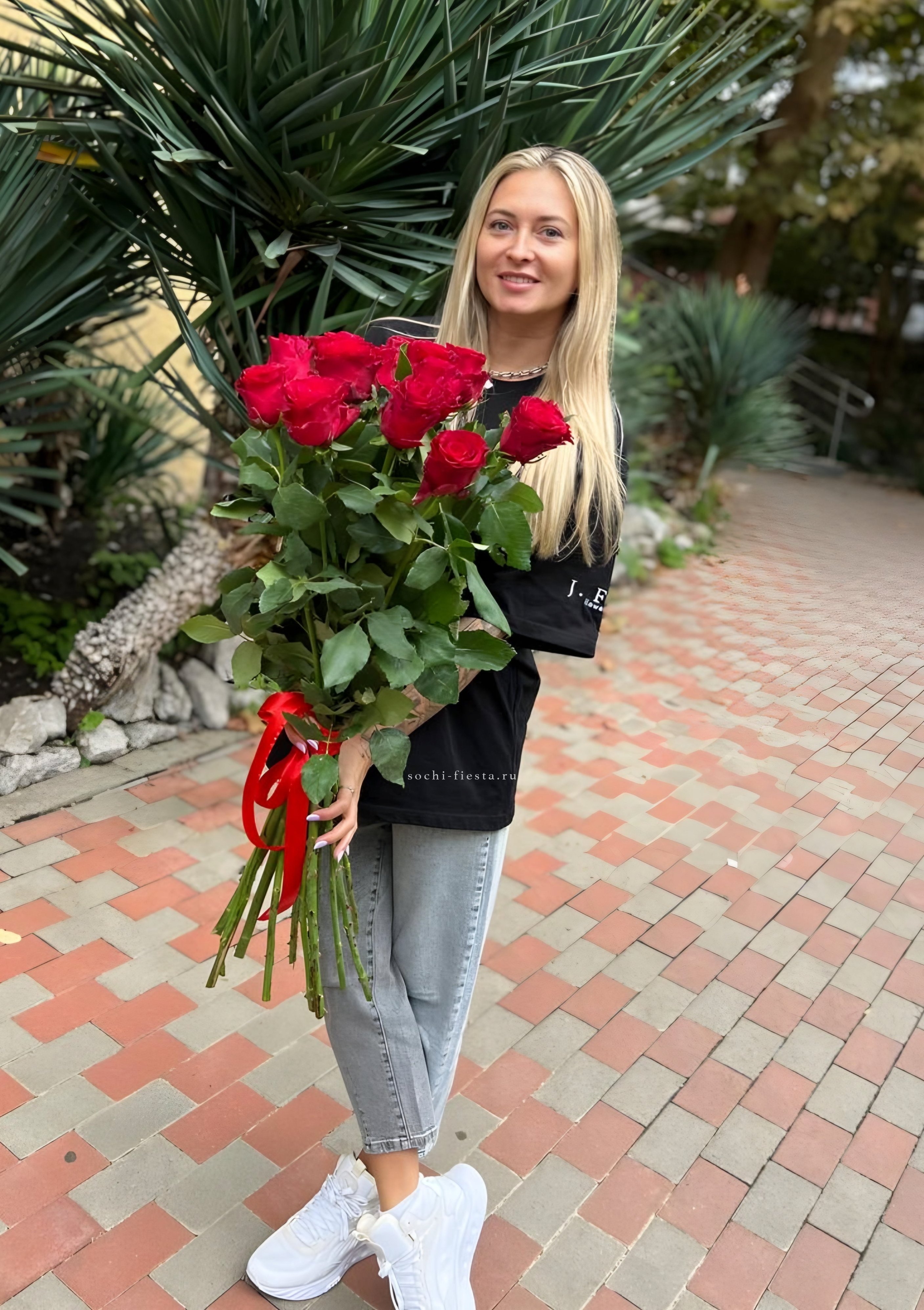 Сто одна красная роза собрана в монохромный букет насыщенного алого оттенка. Высокие стебли создают впечатляющий объем и заполняют пространство уверенным присутствием.