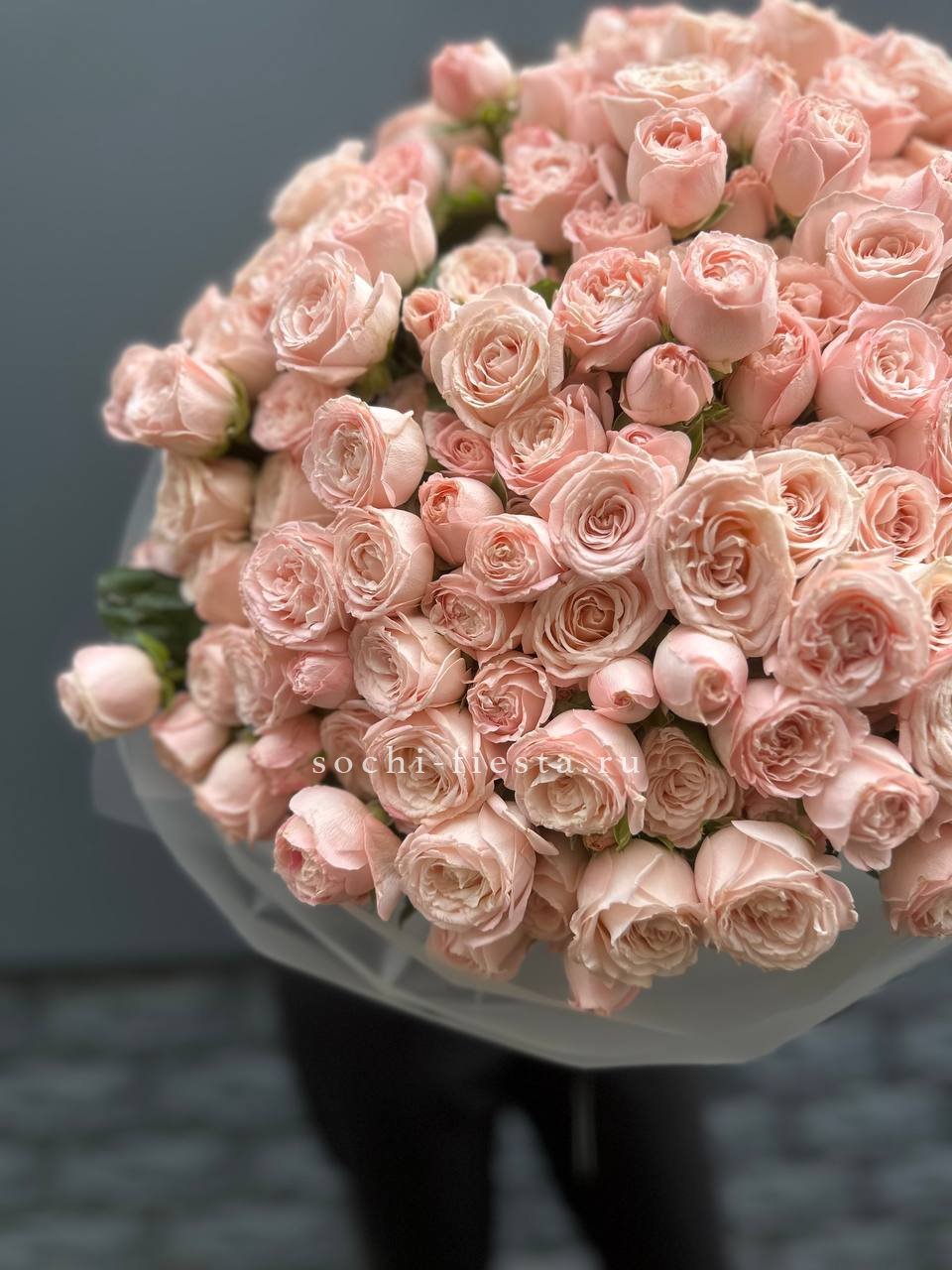 Пятьдесят один бутон сорта Бомбастик с густомахровыми лепестками кремового оттенка. Плотная сборка создает впечатляющий объем и заполняет пространство. Монобукет для тех моментов, когда важен масштаб.