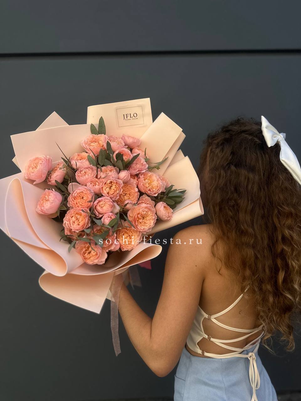 Одиннадцать веток пионовидной розы окружены серебристой зеленью эвкалипта. Фактура многослойных лепестков раскрывается на фоне матовой листвы. Букет дышит и сохраняет объём.