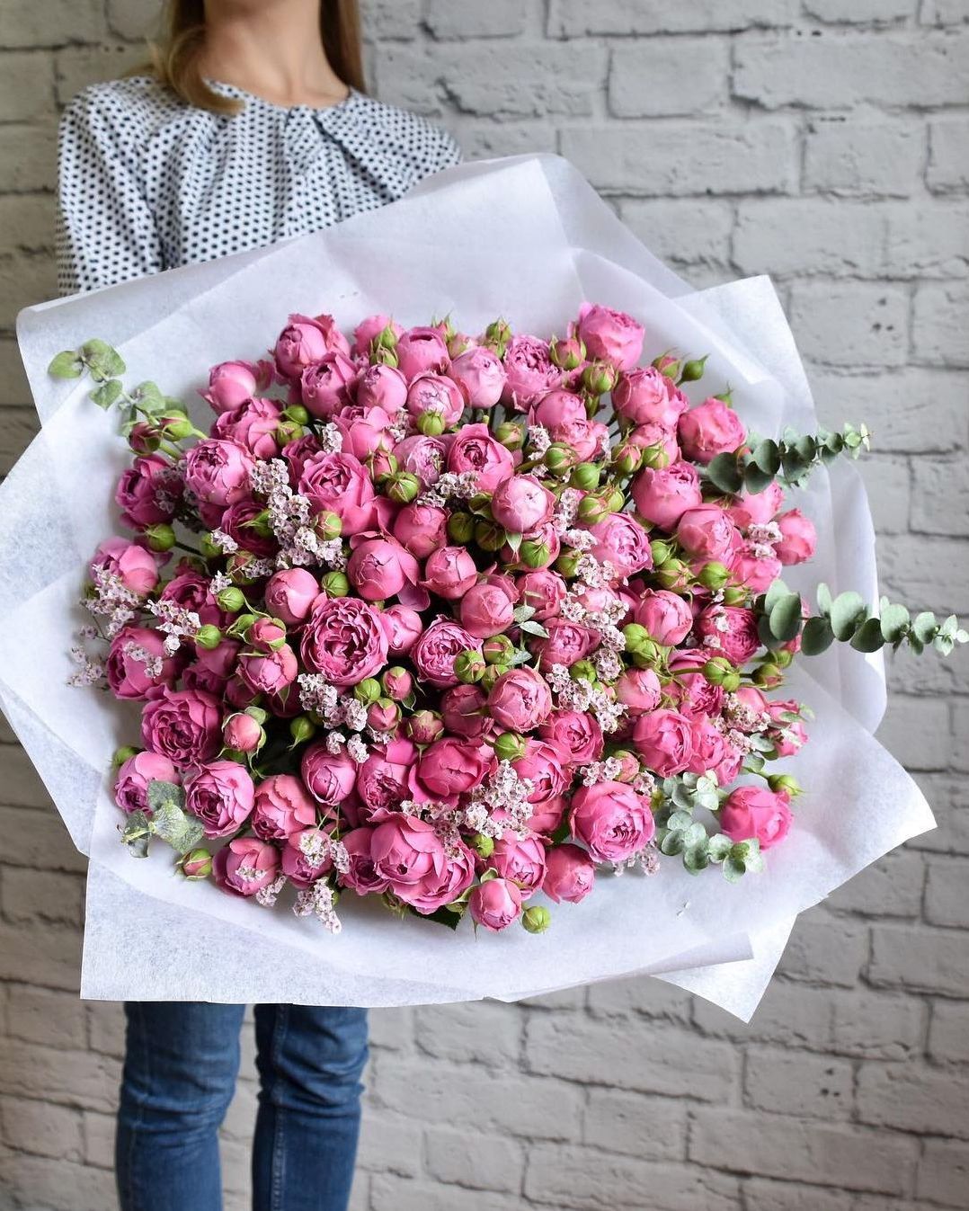 Пионовидные розы с густыми округлыми бутонами в окружении серебристого эвкалипта. Плотная сборка и мягкая палитра создают впечатление спокойной гармонии.