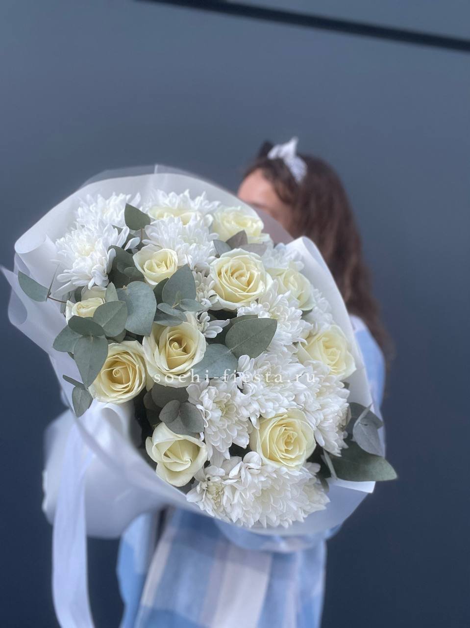 Белоснежные розы собраны в плотный круг и дополнены воздушными соцветиями кустовой хризантемы. Эвкалипт добавляет свежести и завершает композицию мягкими серебристыми оттенками. Букет держит форму и долго сохраняет безупречный вид.