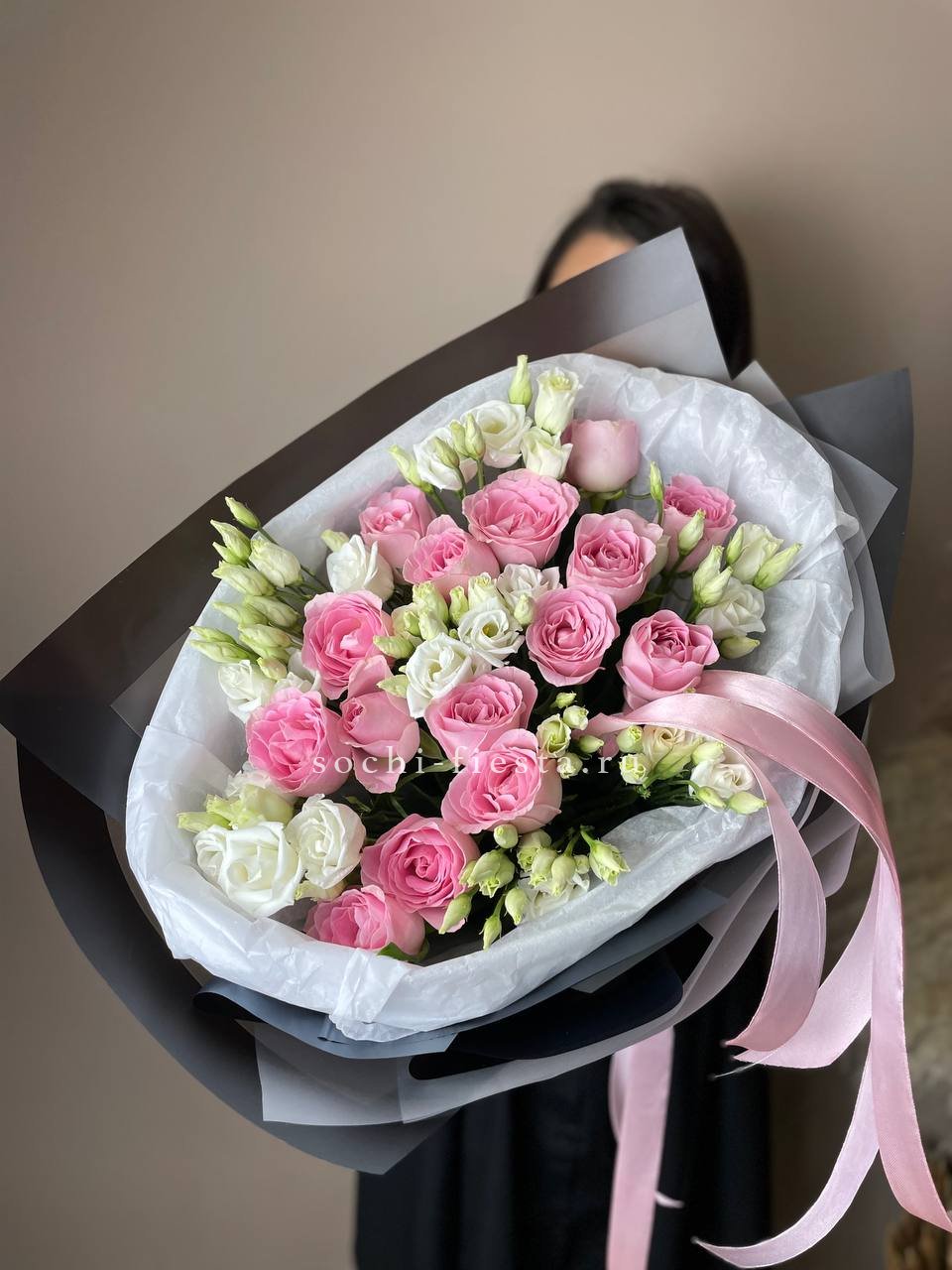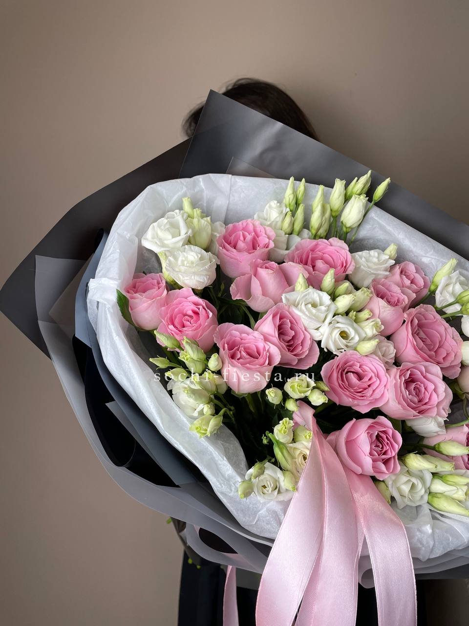 розовые розы, эустома, лента, упаковка.