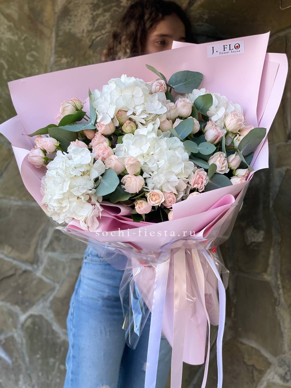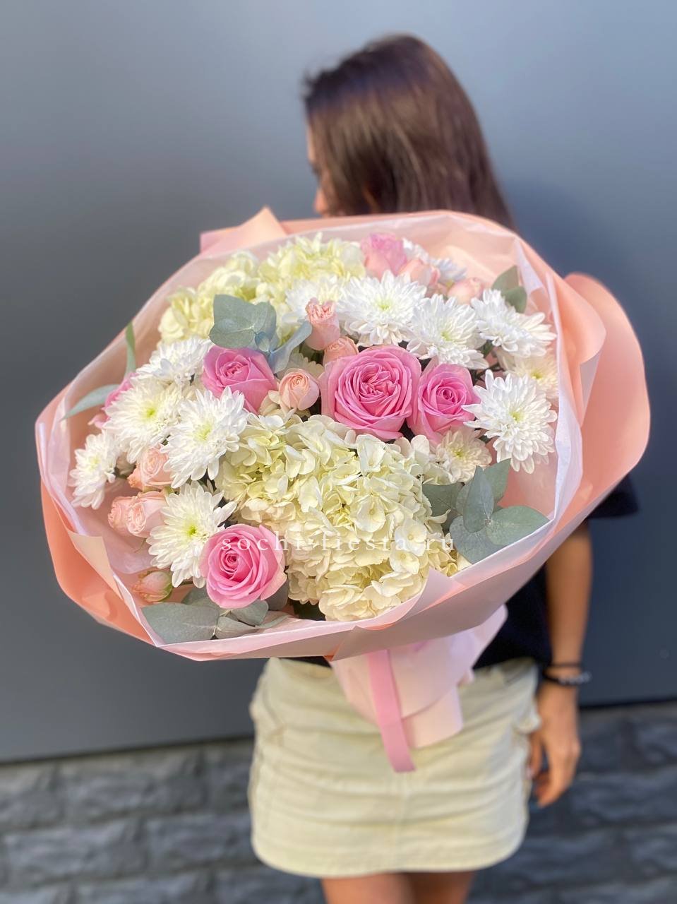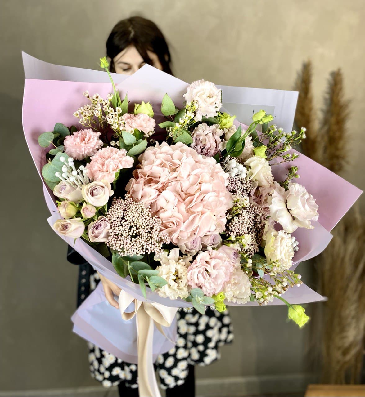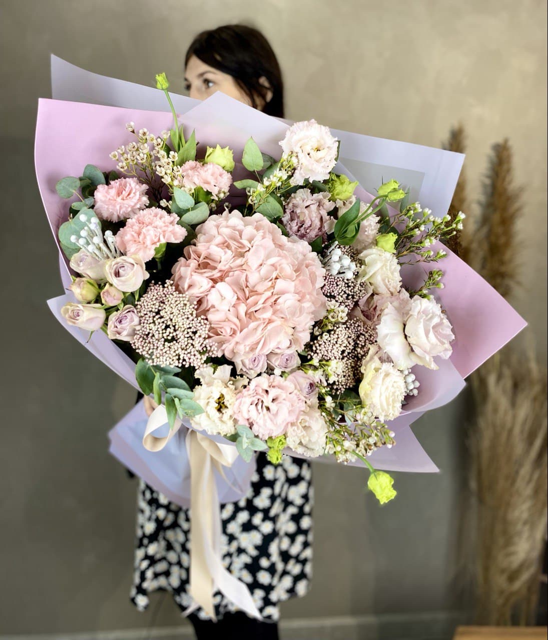 Плотная сборка с пышными соцветиями гортензии и яркими герберами создает объемный силуэт. Маттиола и лимониум добавляют воздушности по краям, а диантусы заполняют центр мягкими переходами.