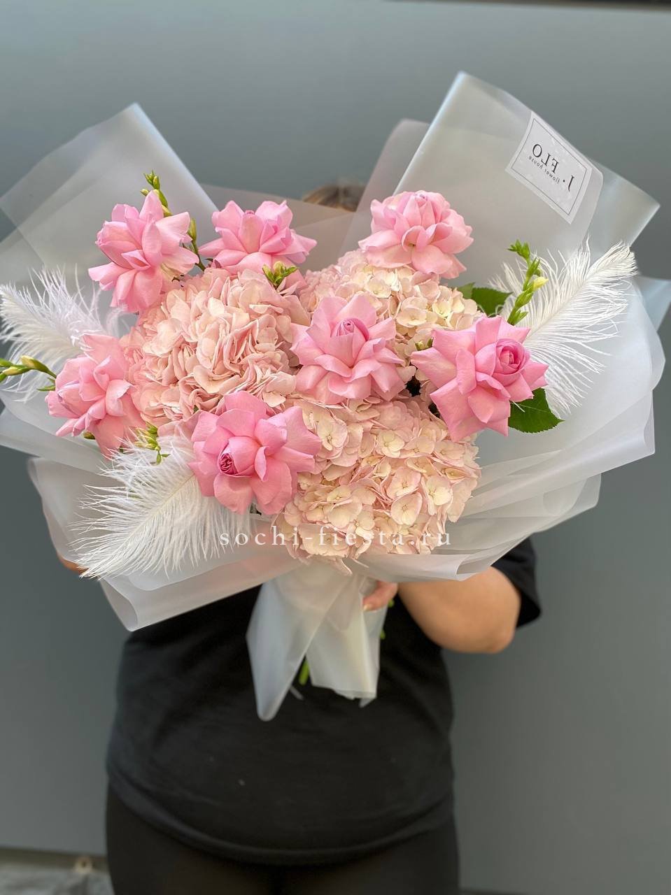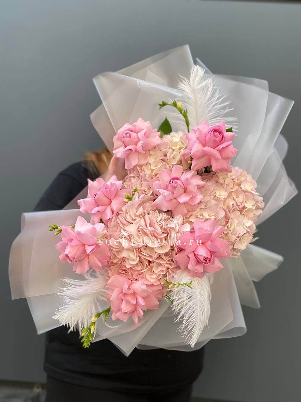французские розы, маттиола, гортензии, эвкалипт, стифа, упаковка, лента.