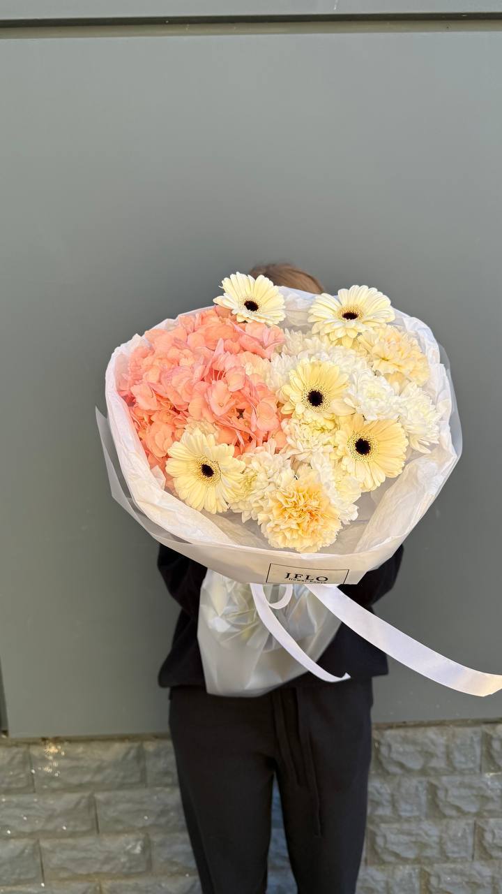 Французские розы и кустовые хризантемы собраны в букет с плотной текстурой и мягким переходом оттенков. Композиция держит форму и долго сохраняет свежесть.