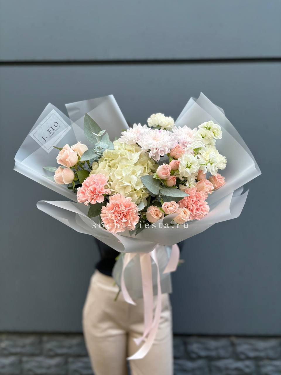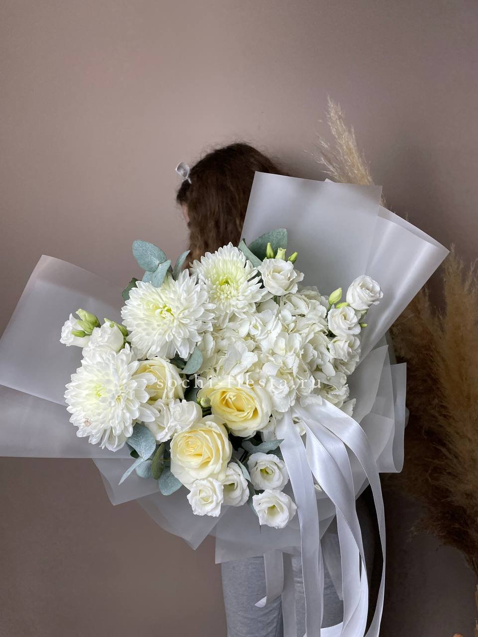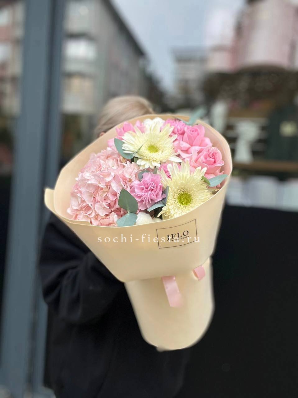гортензия, хризантема, роза, эустома, упаковка, лента.