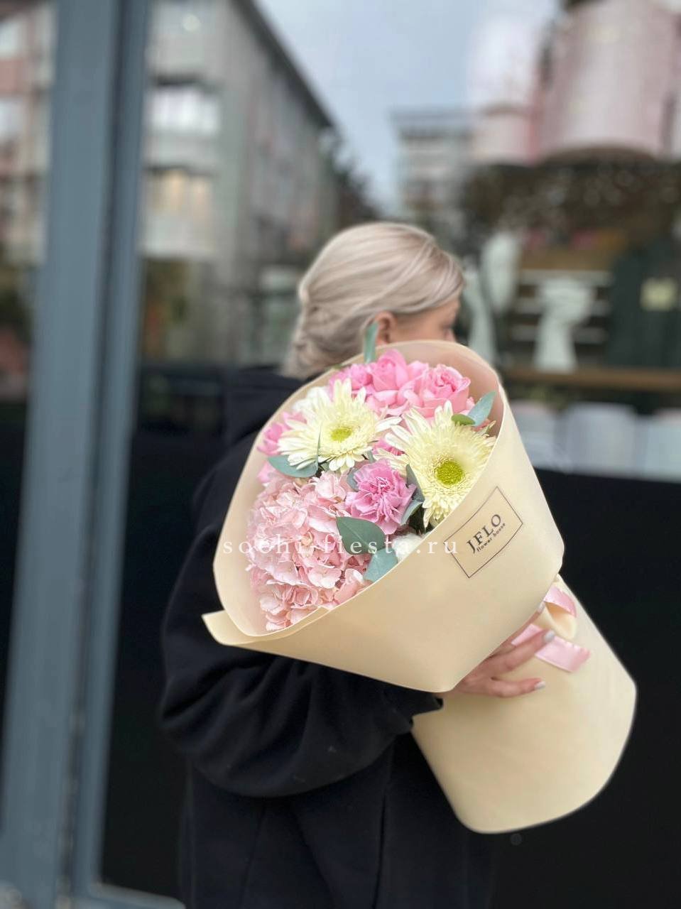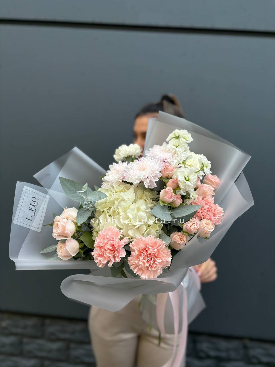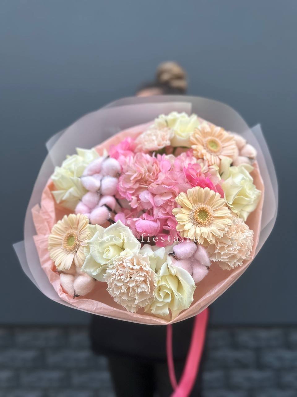 гортензия, хризантема, роза, эустома, упаковка, лента.