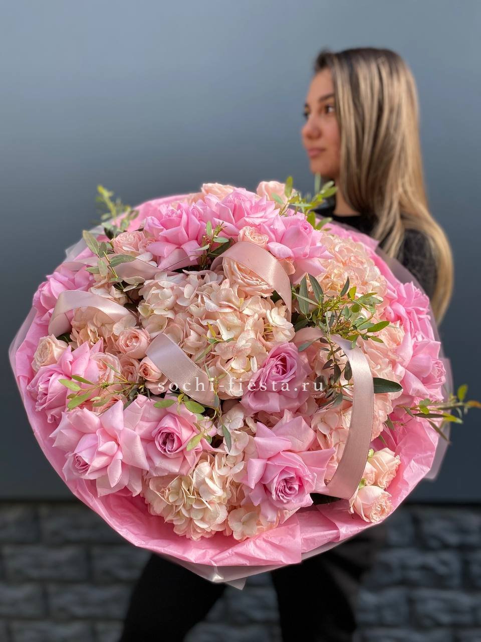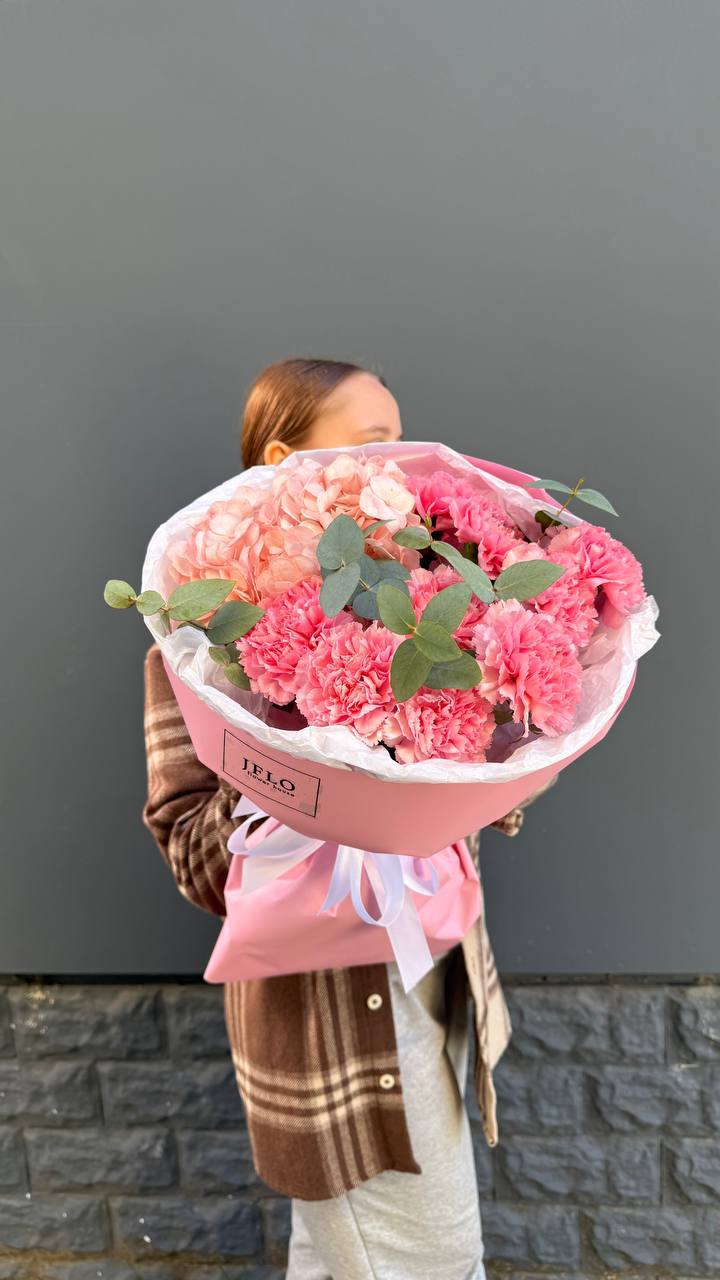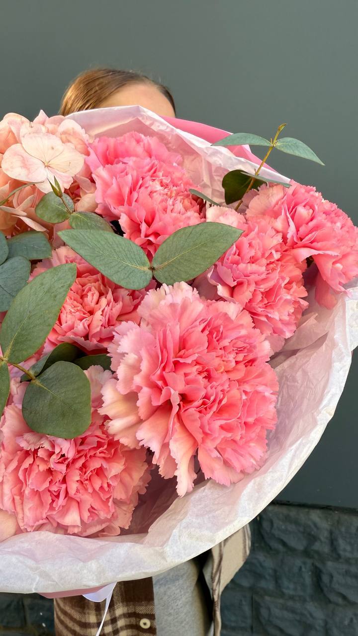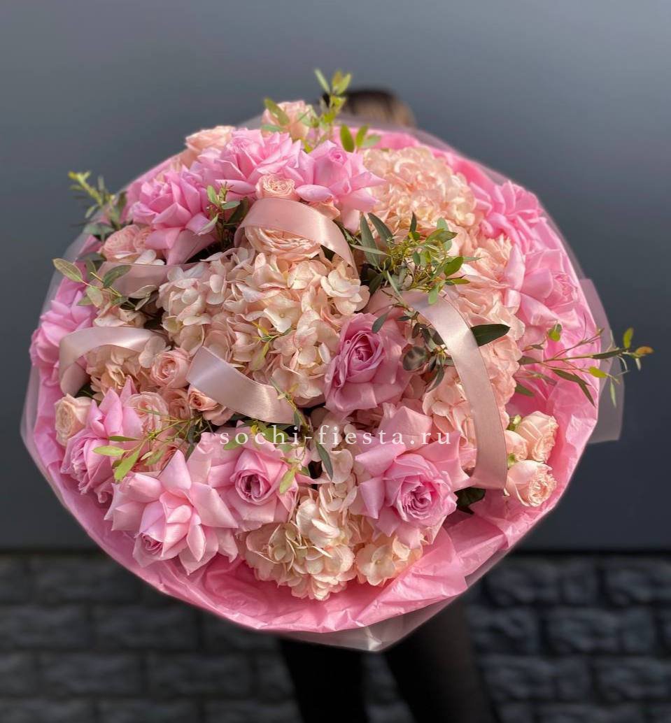гортензия, диантус, хризантема, эустома, розы, озатамус, пленка.
