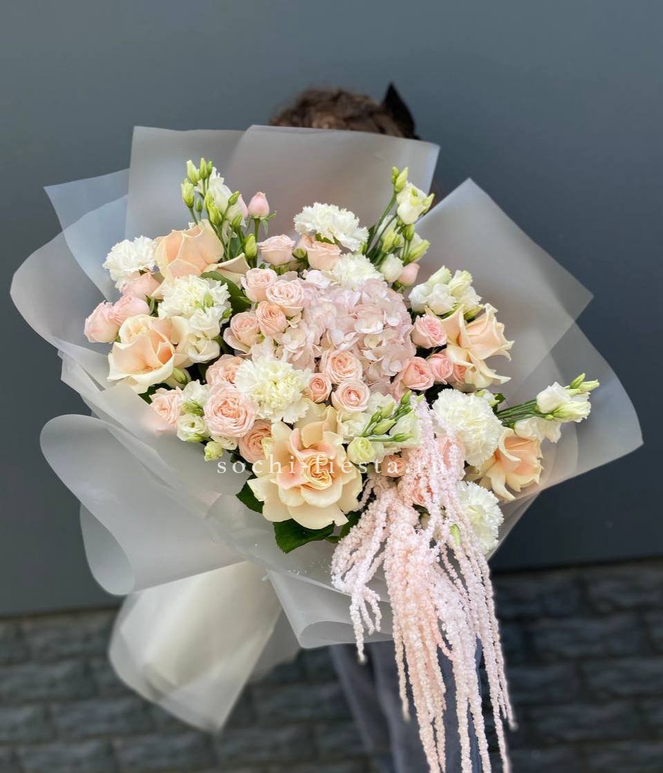 Монохромная палитра с многослойной структурой. Французские розы и эустомы чередуются с кустовыми бутонами, гортензии заполняют объём, а диантусы создают точечные акценты. Букет выглядит цельно и графично.