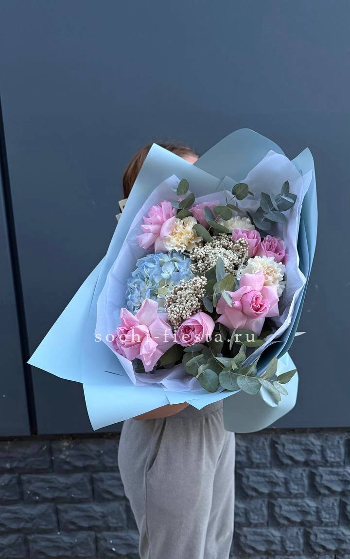 Белоснежные розы и пышные шапки гортензии сплетаются в плотную композицию, где эвкалипт задаёт спокойный ритм. Букет хорошо держит форму и долго сохраняет свежесть в вазе.