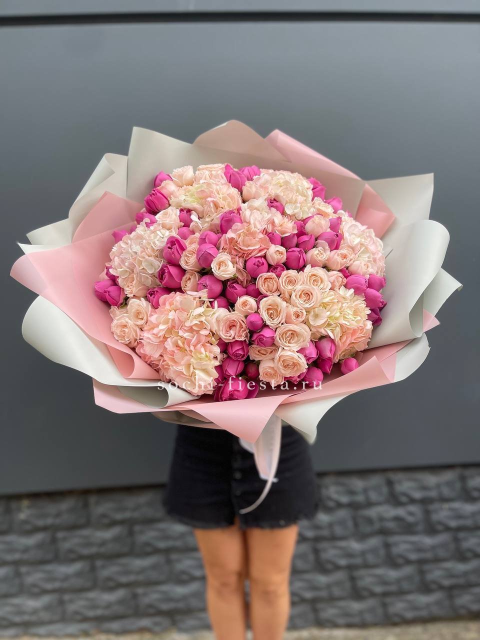 Для заказа товара "Букет с гортензией и белыми французскими розами" с доставкой в Нальчике нажмите в корзину