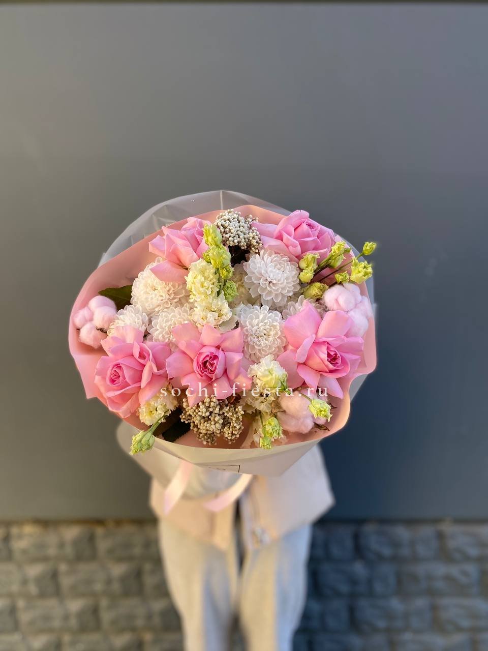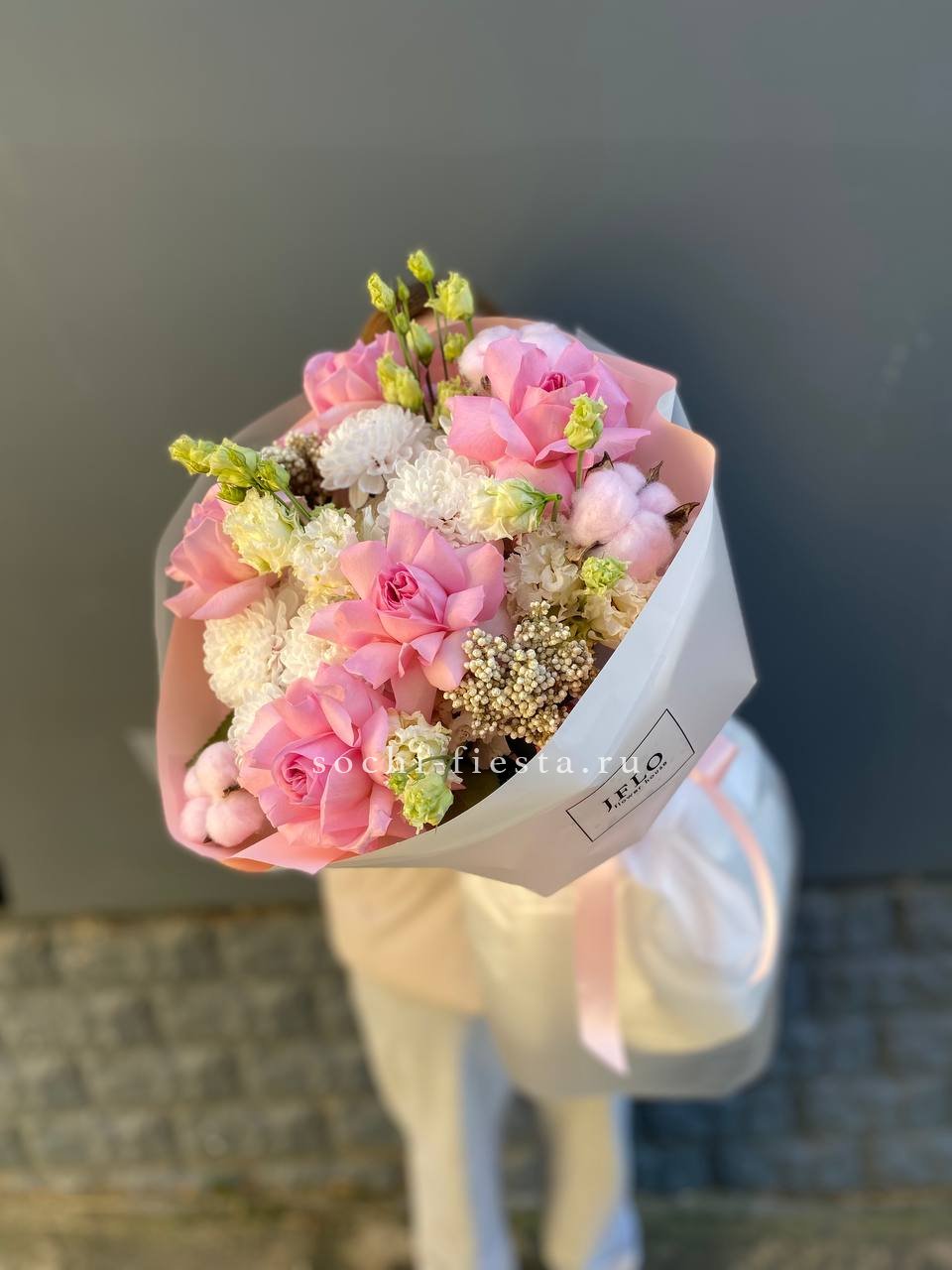 розовые розы, сирень, эвкалипт, лента, авторское оформление.