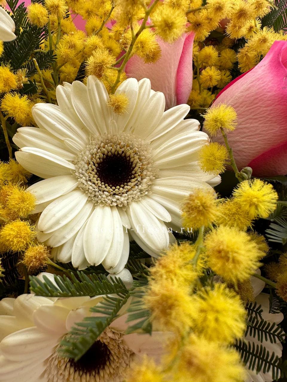 Солнечная мимоза встречается с яркими гербераами и розами Венди в жизнерадостной композиции. Тёплые оттенки создают весеннее настроение и дарят улыбку.