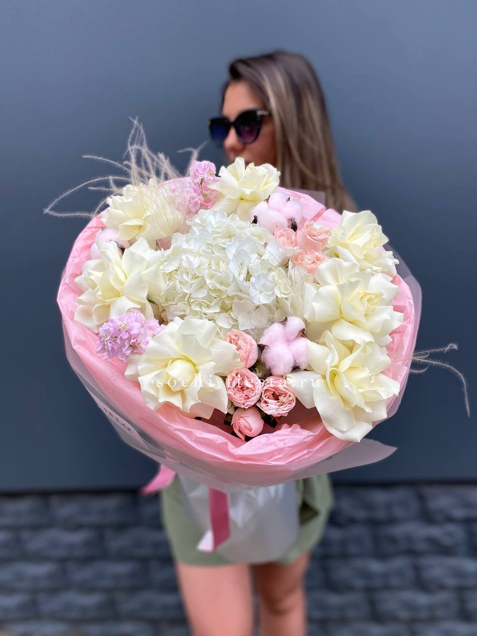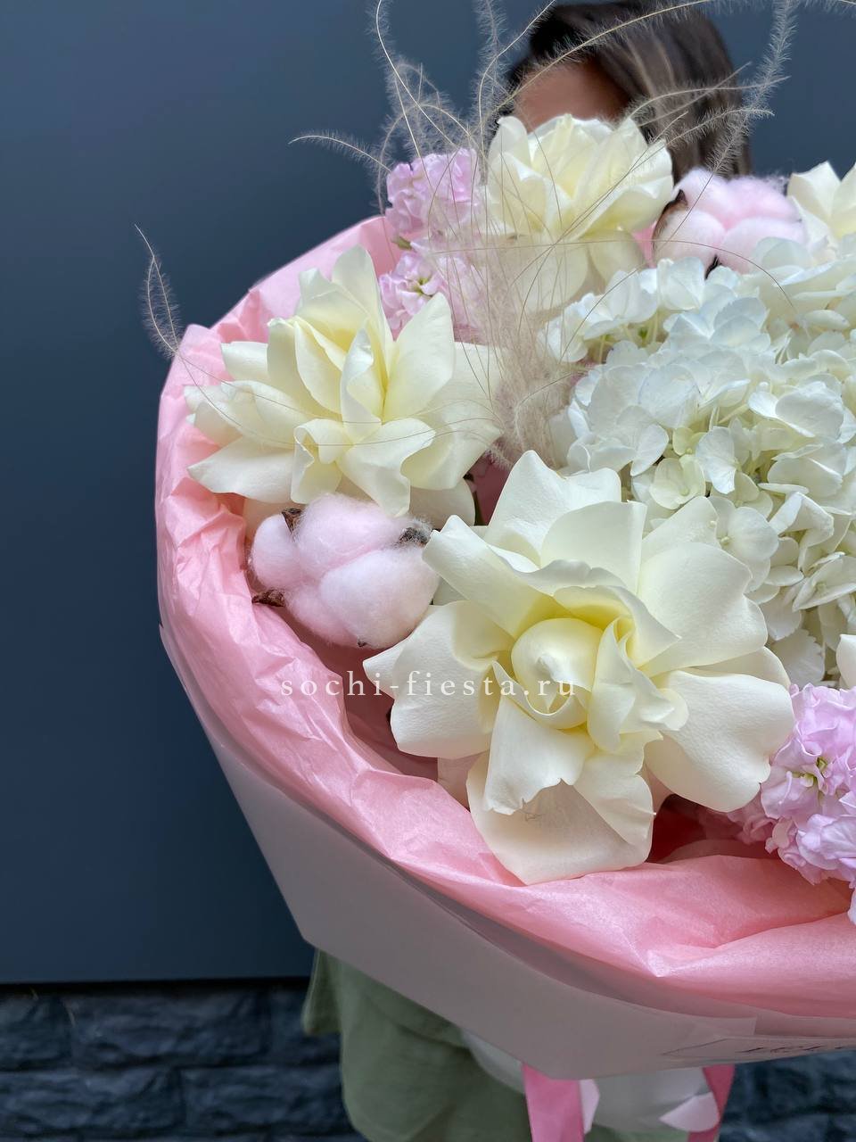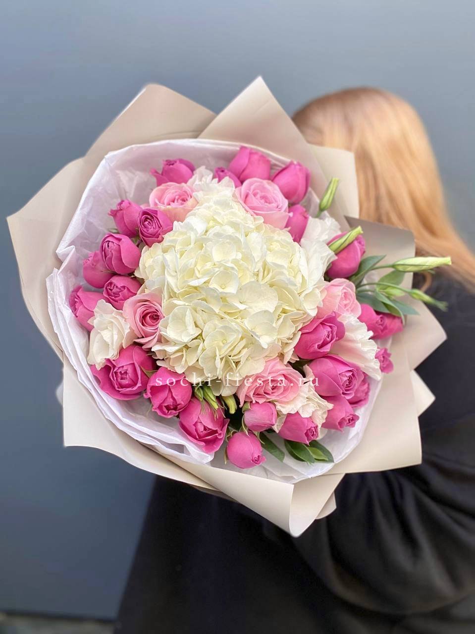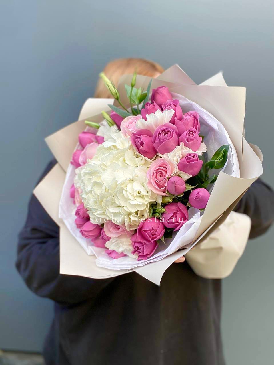 Плотная сборка с пышной гортензией в центре и рассыпчатыми соцветиями диантуса по краям. Эустома добавляет воздушности, а ветки озатамуса создают лёгкую графику. Букет держит форму и выглядит объёмно с любого ракурса.