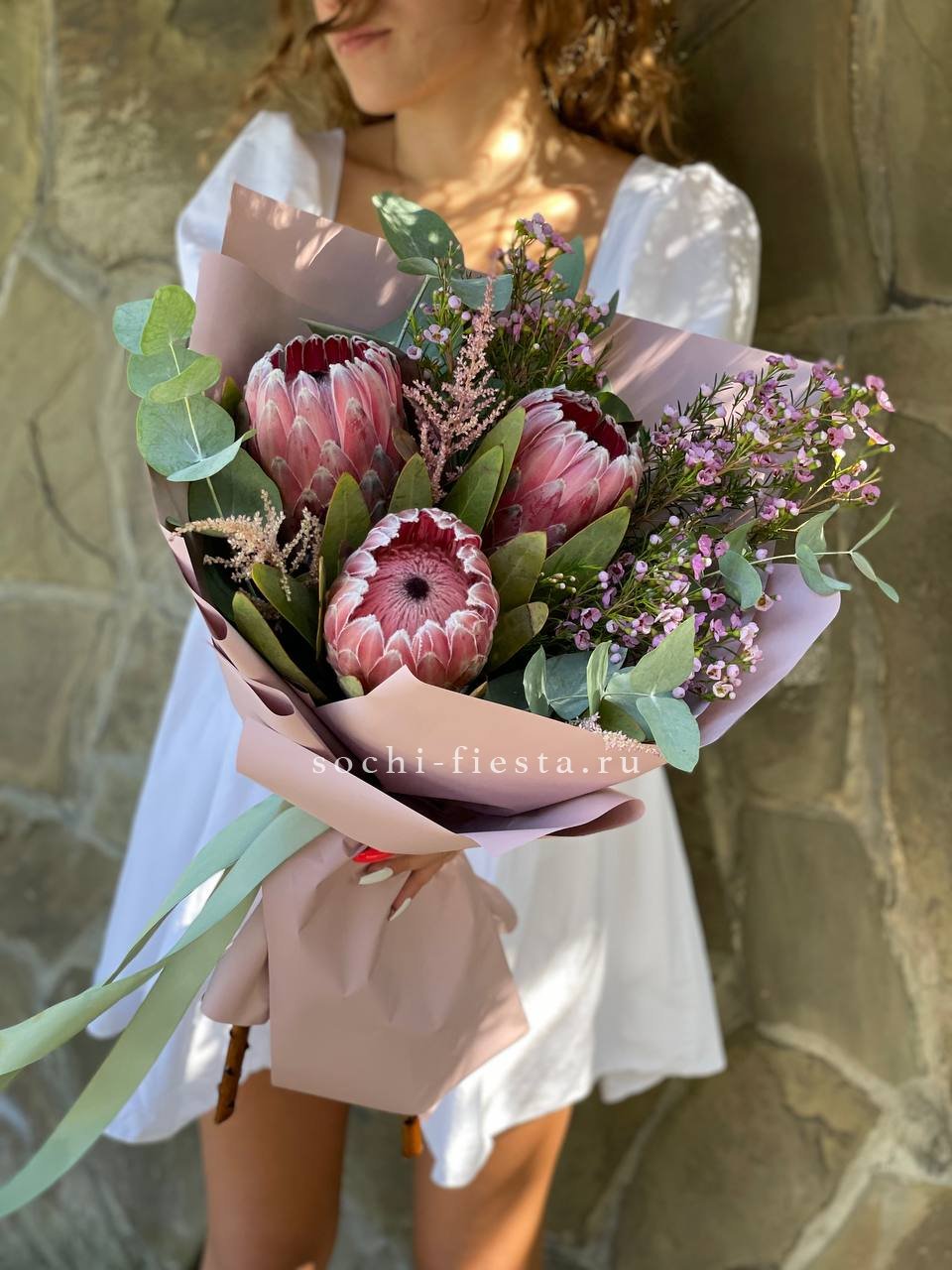 диантус, эустома, гортензия, хайди, эвкалипт, озатамус, пленка.