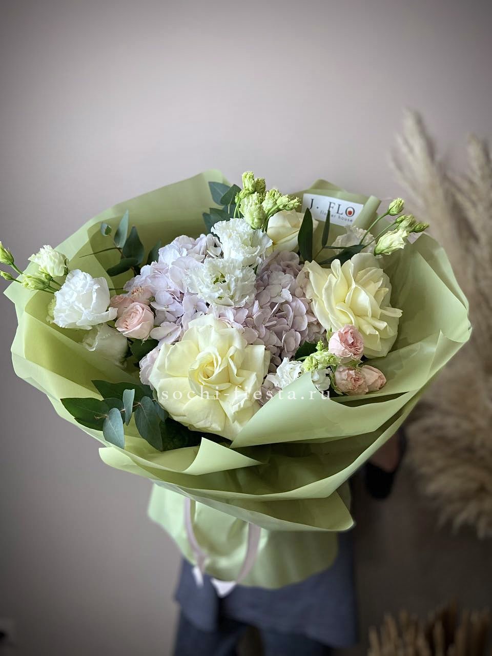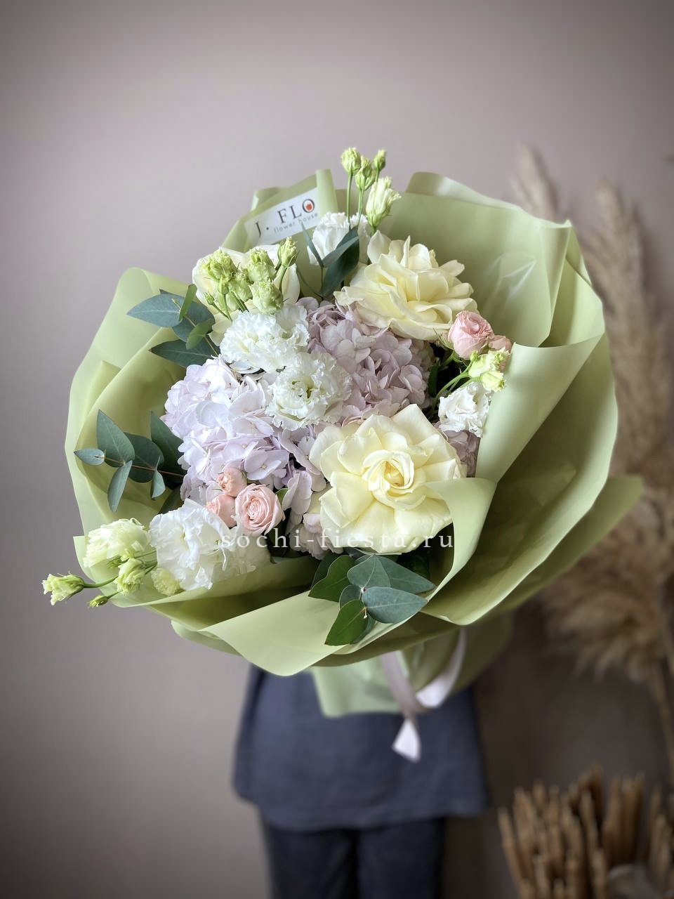 гортензия, розовые розы, кустовые розы, маттиолы,, лимониум лента и дизайнерская пленка.