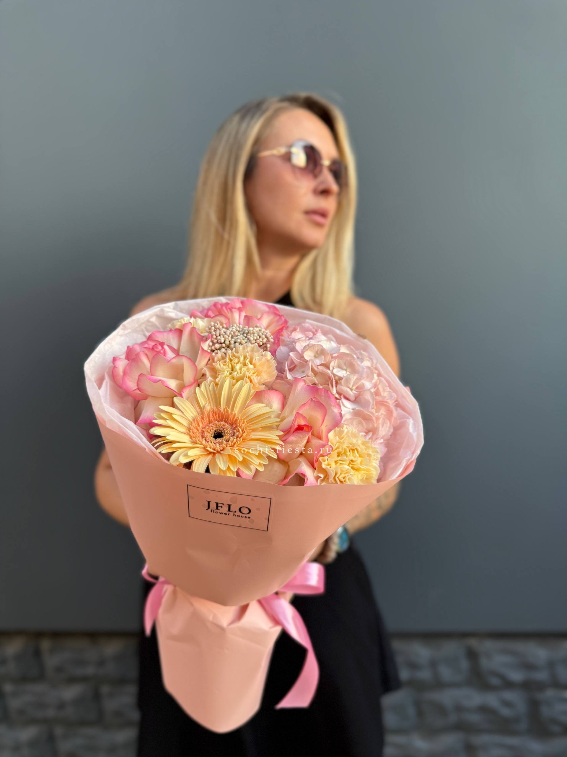 Пышная шапка из гортензии и пионовидных роз собрана с филигранной точностью. Диантус и эустома создают воздушные переходы между крупными соцветиями, а озотамнус добавляет графичные вертикали. Букет для тех, кто понимает язык авторской флористики.