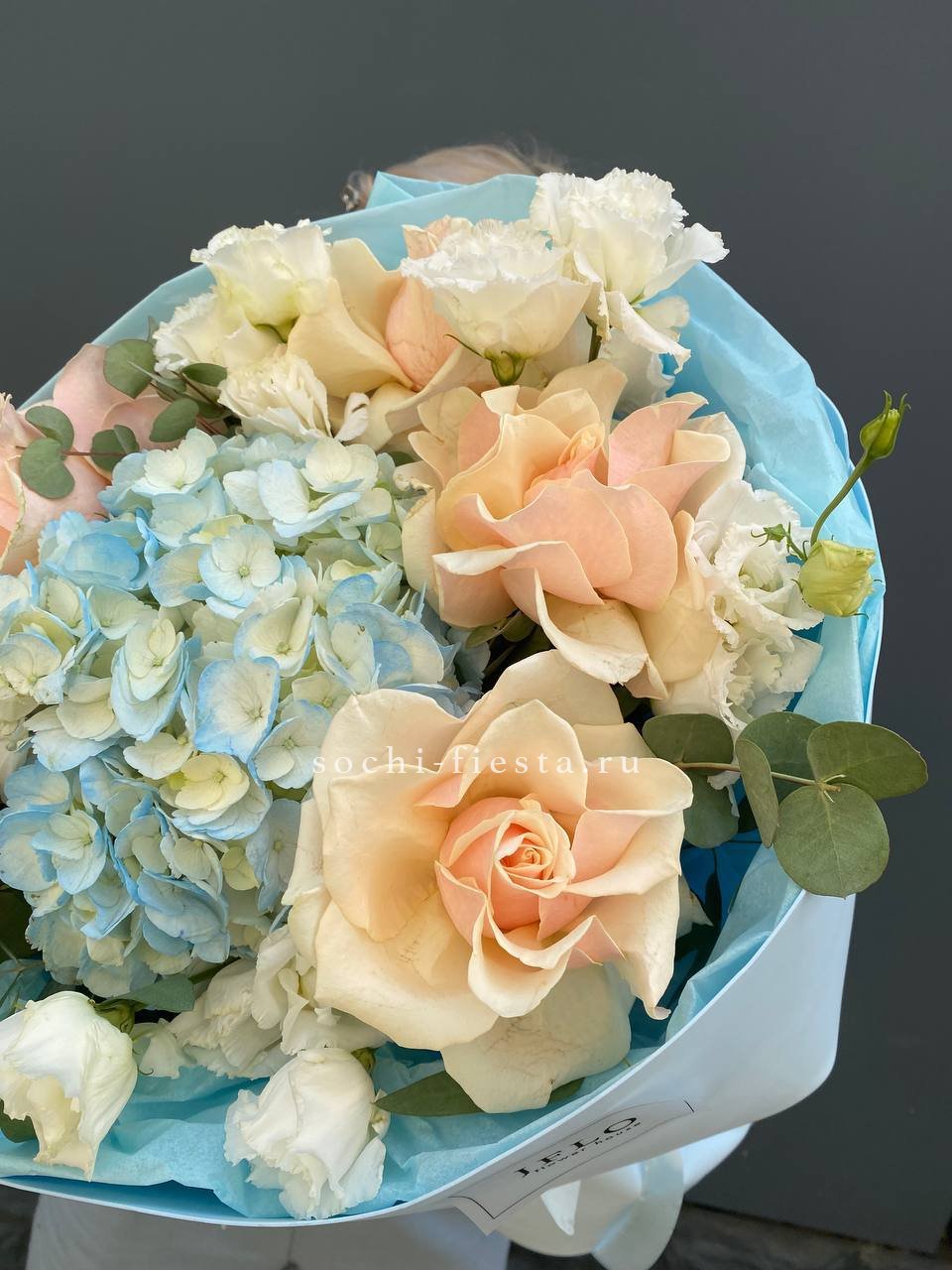 Кремовые розы окружены облаками гортензии, а эустома расставляет светлые акценты по краям. Букет держит форму и при этом выглядит объемно благодаря многослойной сборке.