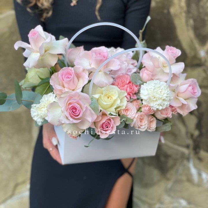 - Шляпная коробка с розами и гипсофилой — универсальный подарочный формат.