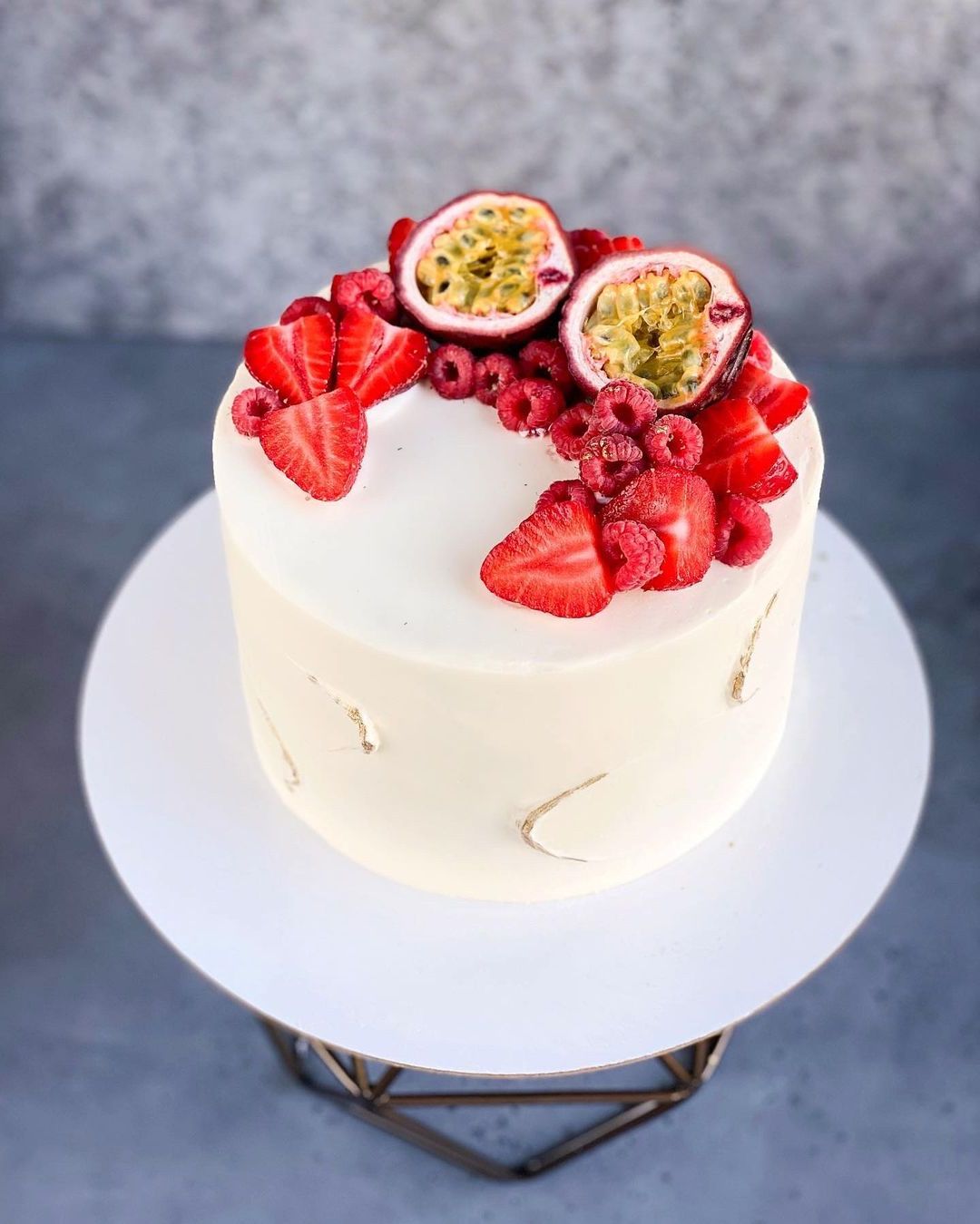 Светлая поверхность с мазками крема и декором в виде бабочек создаёт летнее настроение. Торт сочетает воздушность формы и плотность начинки на выбор из трёх вкусов.